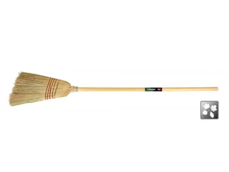 Heksenbezem met houten steel·Met extra versteviging door metalen ring en stiksels·Totale lengte: 146cm·Breedte bezem: 30cm·Lengte steel: 100cm