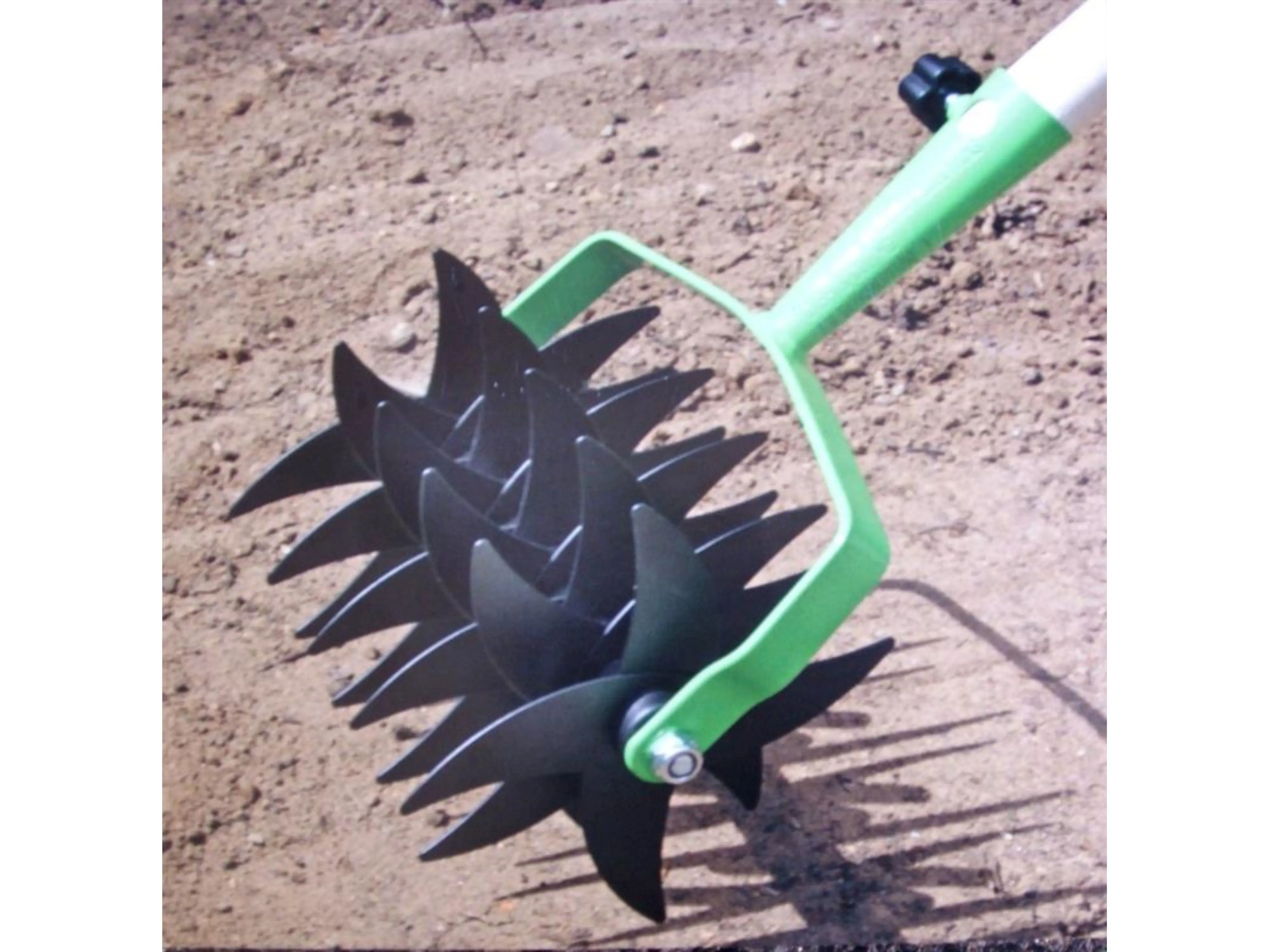Met dit gereedschap verkruimel je de grond van jouw moes- of siertuin. Dit tuingereedschap bewerkt jouw tuingrond als een handige breker, de 9 schijven met telkens 4 messen, zorgen voor een gelijkmatig resultaat. De messen banen zich een weg doorheen de grond en verwerken de grote brokken grond tot fijnere, goed bewerkbare grond.