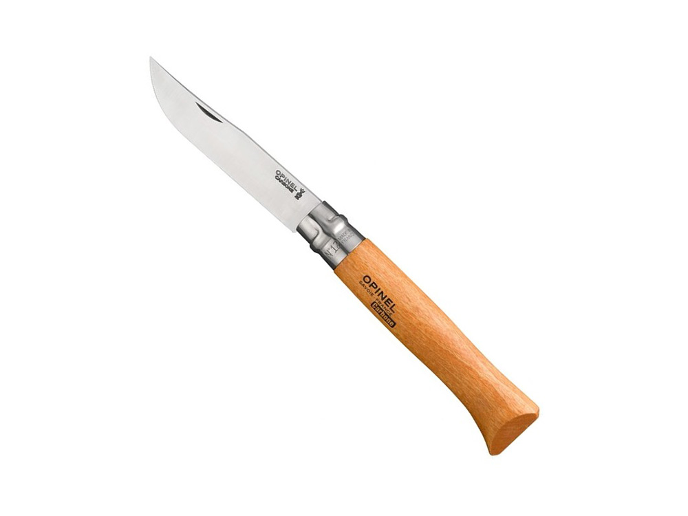 Groot vouwbaar zakmes van het merk Opinel. De 'tradition' reeks heeft een lemmet in carbonstaal waarbij er dus kans is op roestvorming. Het voordeel van carbonstaal is dan weer dat je het vlijmscherp kan slijpen, beter dan RVS. Opinel N°12 wordt door z'n grote vaak gebruikt op boerderijen en tijdens de jacht, het kan ook dienen als keukenmes.