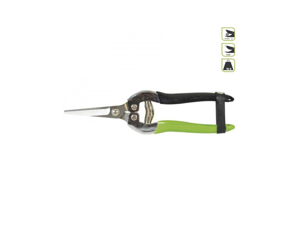 Handige tuinschaar voor het oogsten van druiventrossen, pompoenen, courgettes, tomaten, pepers, aubergines en zo veel meer. Deze oogstschaar met fijne punt en kunststof handgrepen leent zich uitstekend tot het fijnere werk. Geschikt voor snoeihout tot 6 mm. Het snijmes is gemaakt uit roestvast staal (RVS).