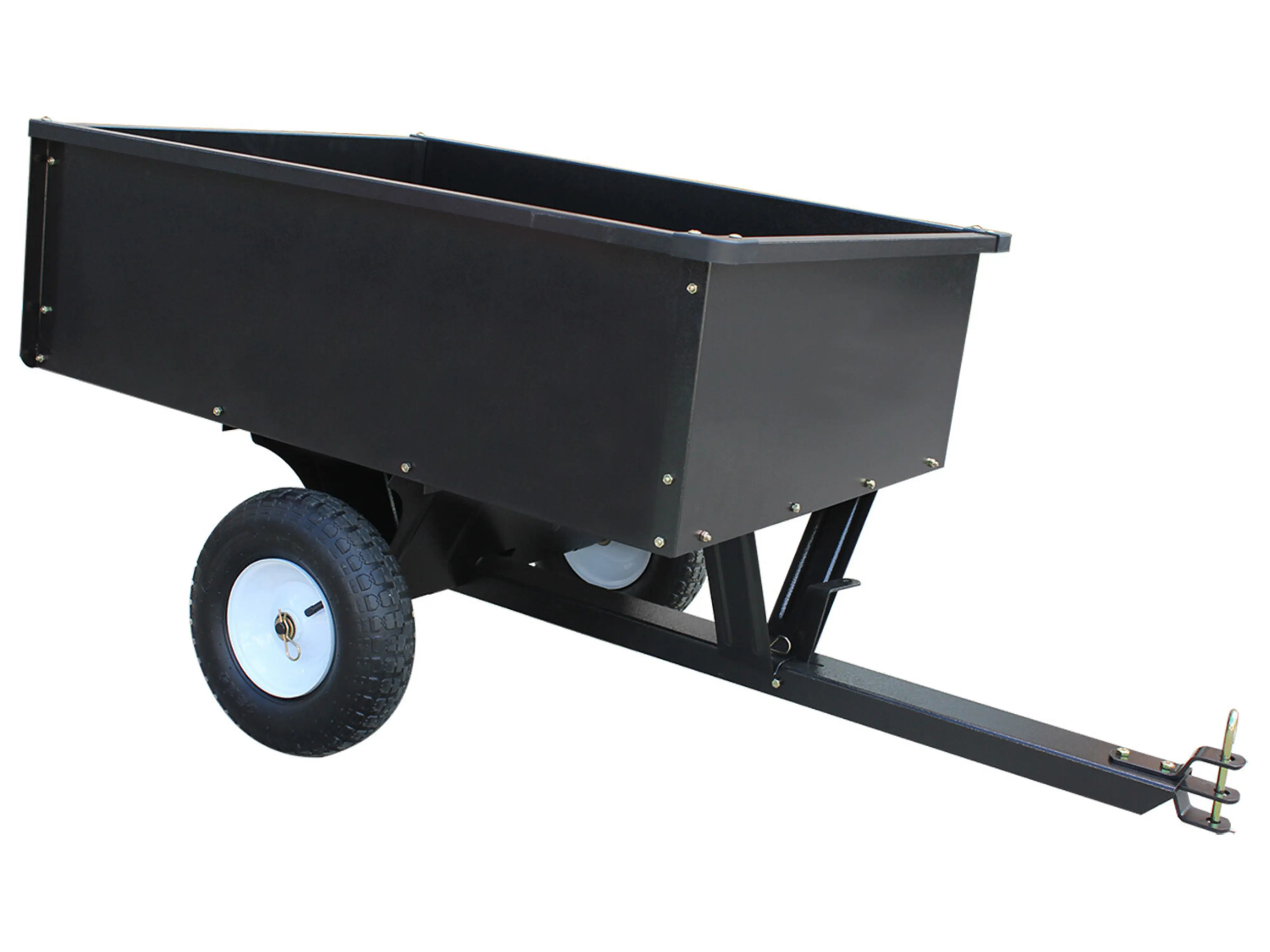 Aanhangwagen TURFMASTER voor achter een standaard zitmaaier of kleine tractor te bevestigen. Deze handige tuinkar heeft een capaciteit van 180 kg en een verwijderbare achterklep.