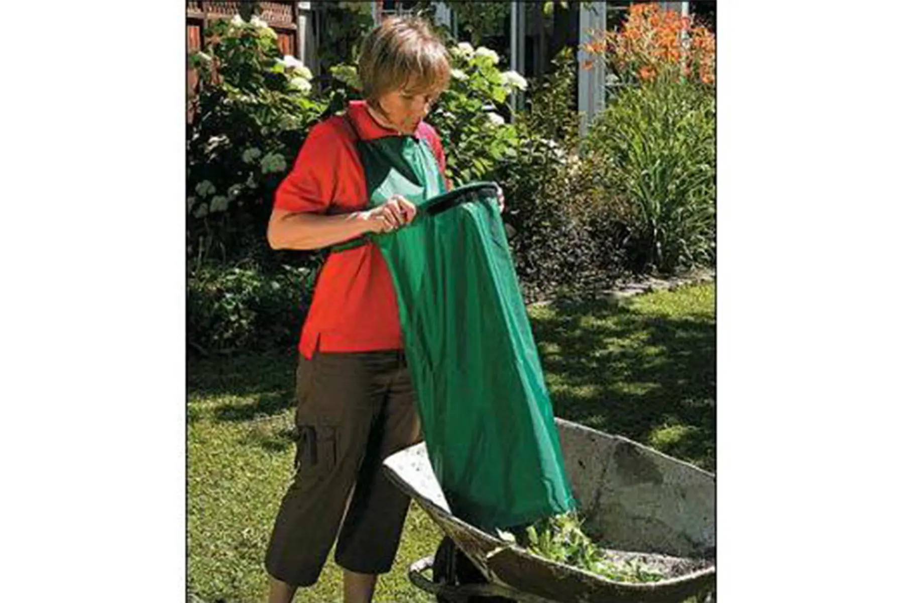 Super originele en handige tuinschort! Ideaal bij het weg plukken van verwelkte bloemen, bij het wieden of snoeien,... Na het snoeien of wieden kan je de uitgebloeide bloemen of onkruid in de schortbuidel deponeren. Ben je klaar met de tuinklus dan hoef je enkel nog de klittenband te lossen zodat de schort zich ontvouwt tot een lange tunnel waarbij alle afval rechtstreeks in een tuinafvalzak, kruiwagen of op de compost kan worden gedropt.
