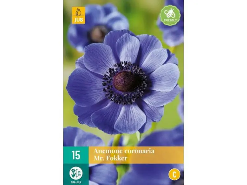 Anemone coronaria Mr. Fokker: Koninklijke blauwe pracht voor je tuin. Ontdek de adembenemende Anemone coronaria Mr. Fokker, een ware blikvanger voor je tuin of border. Deze prachtige anemoon van het merk Jub brengt met zijn intense blauwe bloemen een koninklijke uitstraling in je tuinomgeving. De grotere bloemen van deze coronaria-variant creëren een weelderig bloembed dat perfect combineert met hogere bloembollen zoals tulpen of alliums.