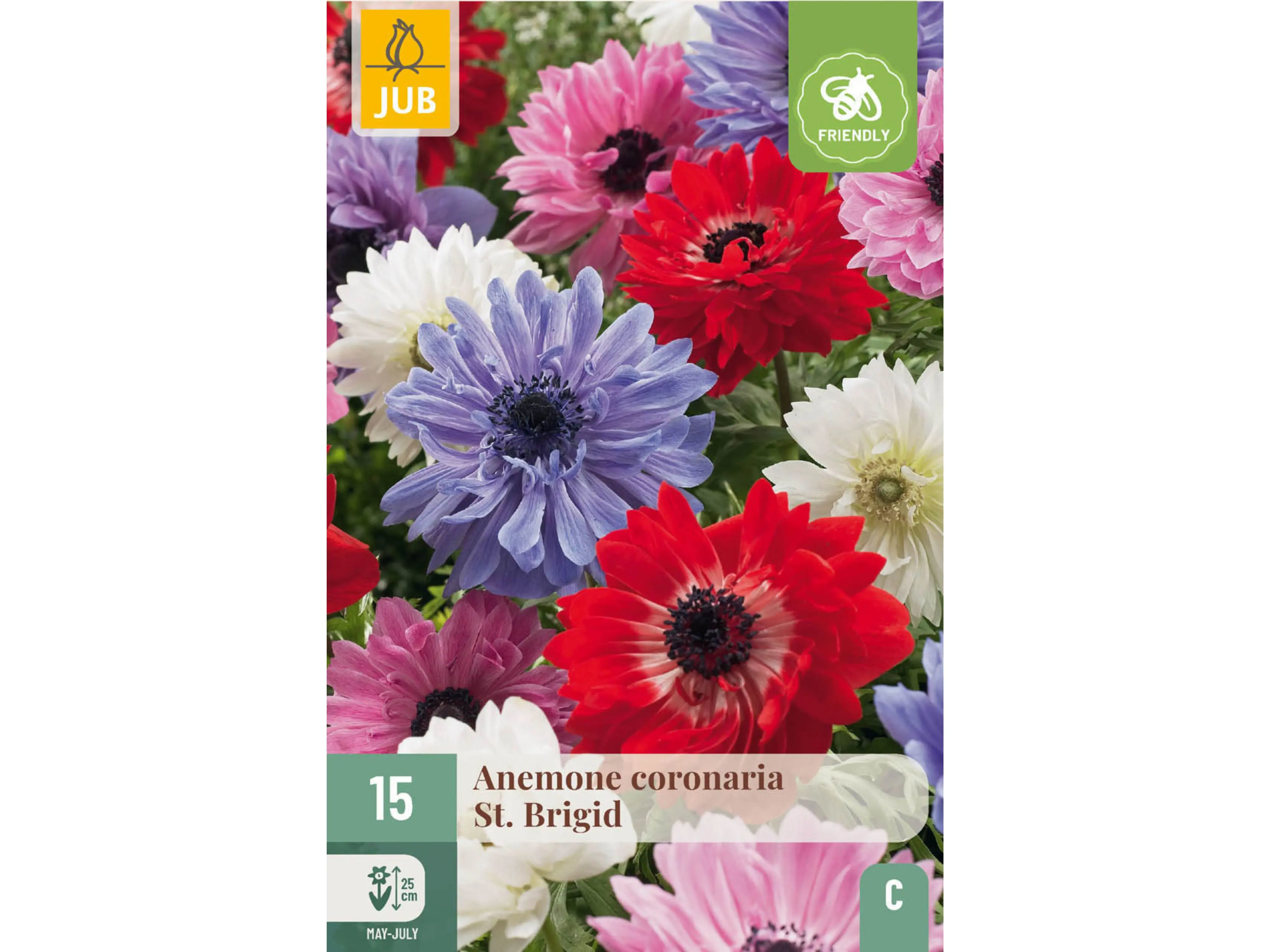 De Anemoon coronaria St. Brigid betovert met dubbelbloemige bloemen in een mix van sprekende kleuren en is een dankbare zomerbloeier die makkelijk bloeit. Deze variëteit is ook een uitstekende snijbloem die lang mooi blijft in de vaas.