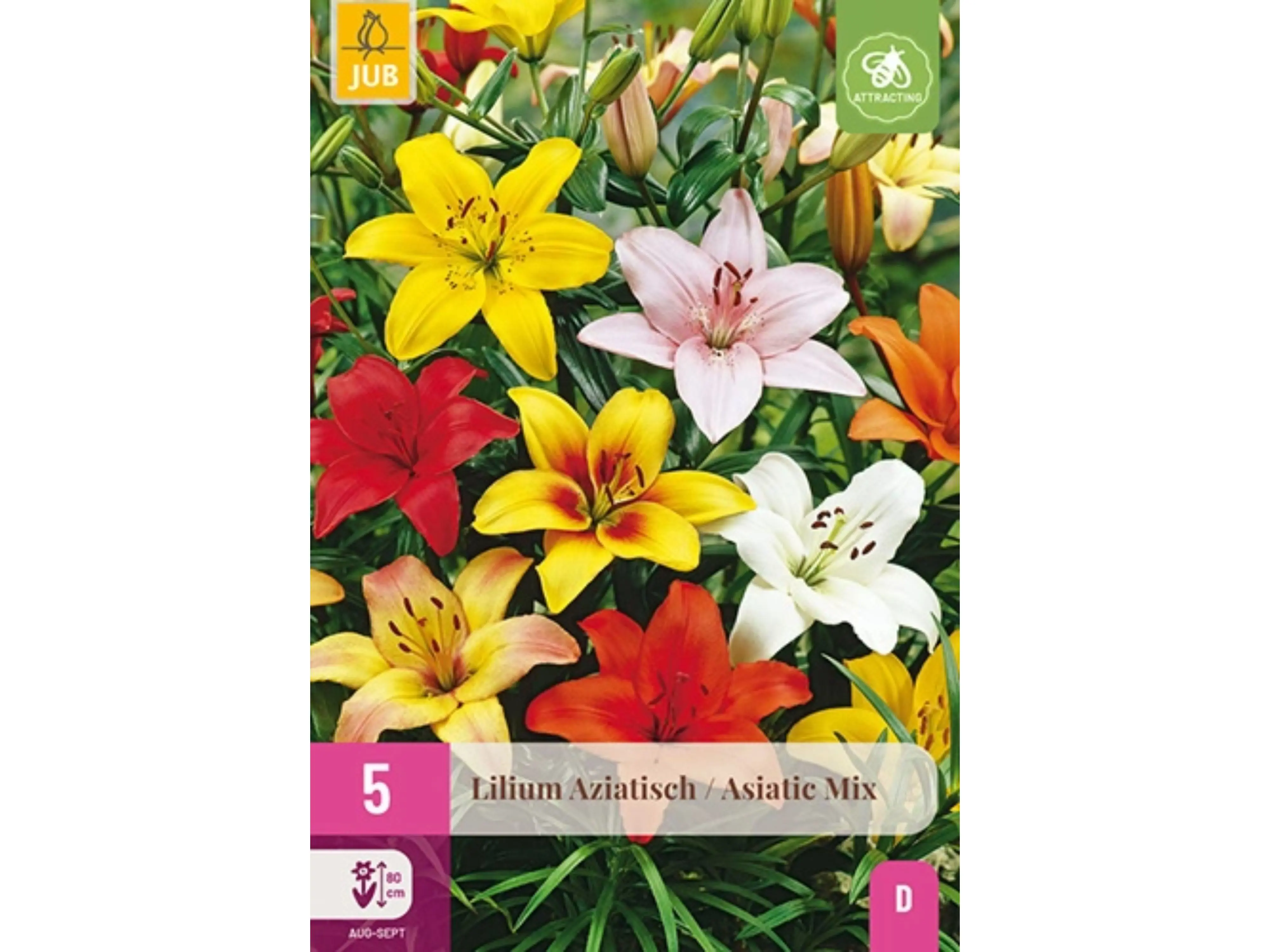 Gemengde Aziatische lelies zijn echte blikvangers, zowel in de tuin als in de vaas. Dankzij hun bijzondere kleuren en stevige stelen zijn ze prachtige tuin- én snijbloemen. Ze worden ongeveer 70–80 cm hoog en komen het best tot hun recht in groepjes tussen vaste planten en struiken. Na de bloei mogen de bollen gewoon in de grond blijven, waar ze jaar na jaar opnieuw rijk bloeien. Ook in potten en plantenbakken doen deze lelies het uitstekend.