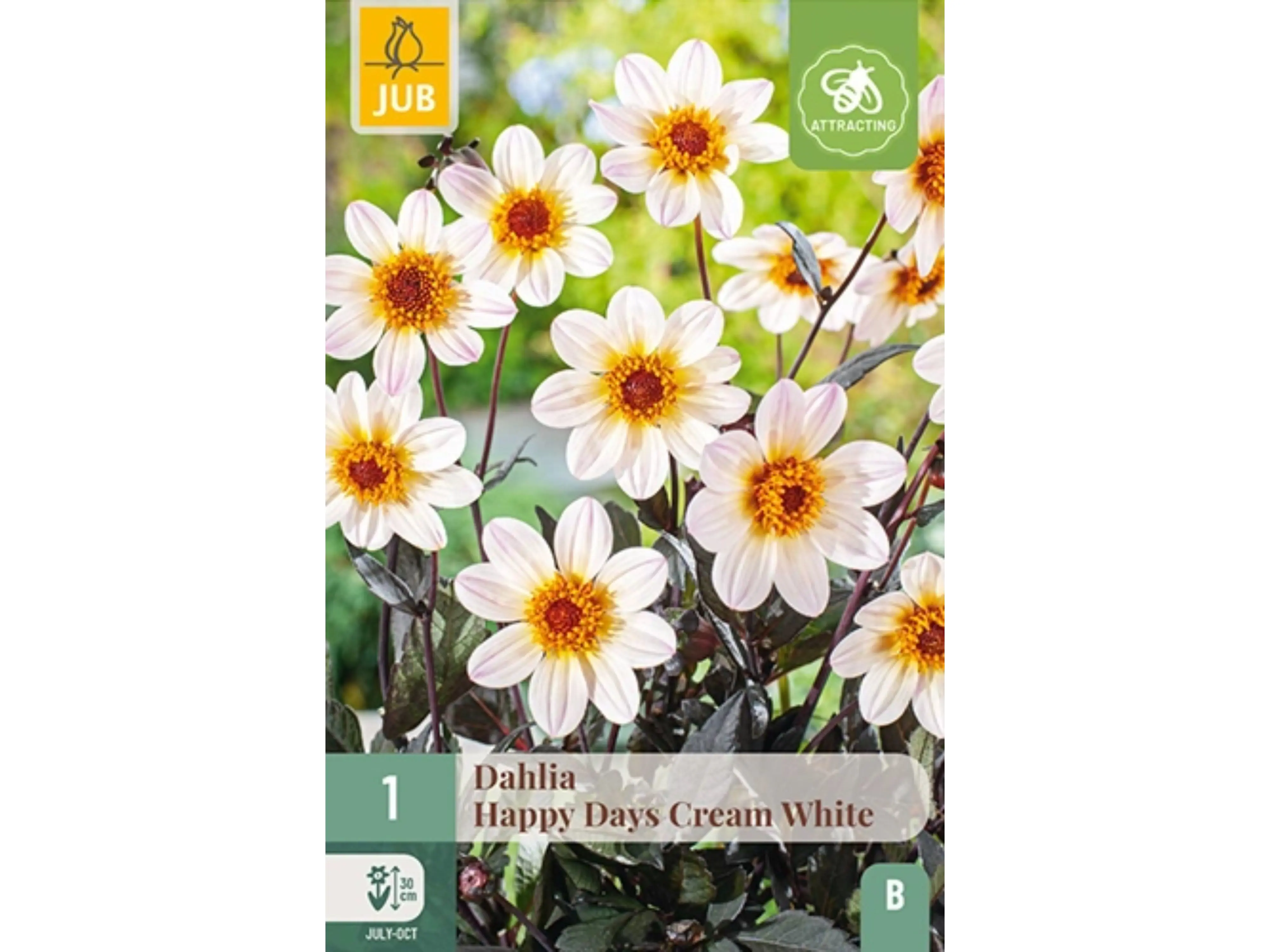 De witte dahlia ‘Happy Days Cream White’ is een charmante zomerbloeier die maandenlang kleur en plezier in de tuin brengt. Het donkere, glanzende blad vormt een mooi contrast en maakt deze dahlia tot een opvallende toevoeging in de border. Van juli tot de eerste nachtvorst verschijnen de creme-witte bloemen in volle bloei. De plant wordt ongeveer 30 cm hoog en kan bij zware bloei soms wat steun nodig hebben.