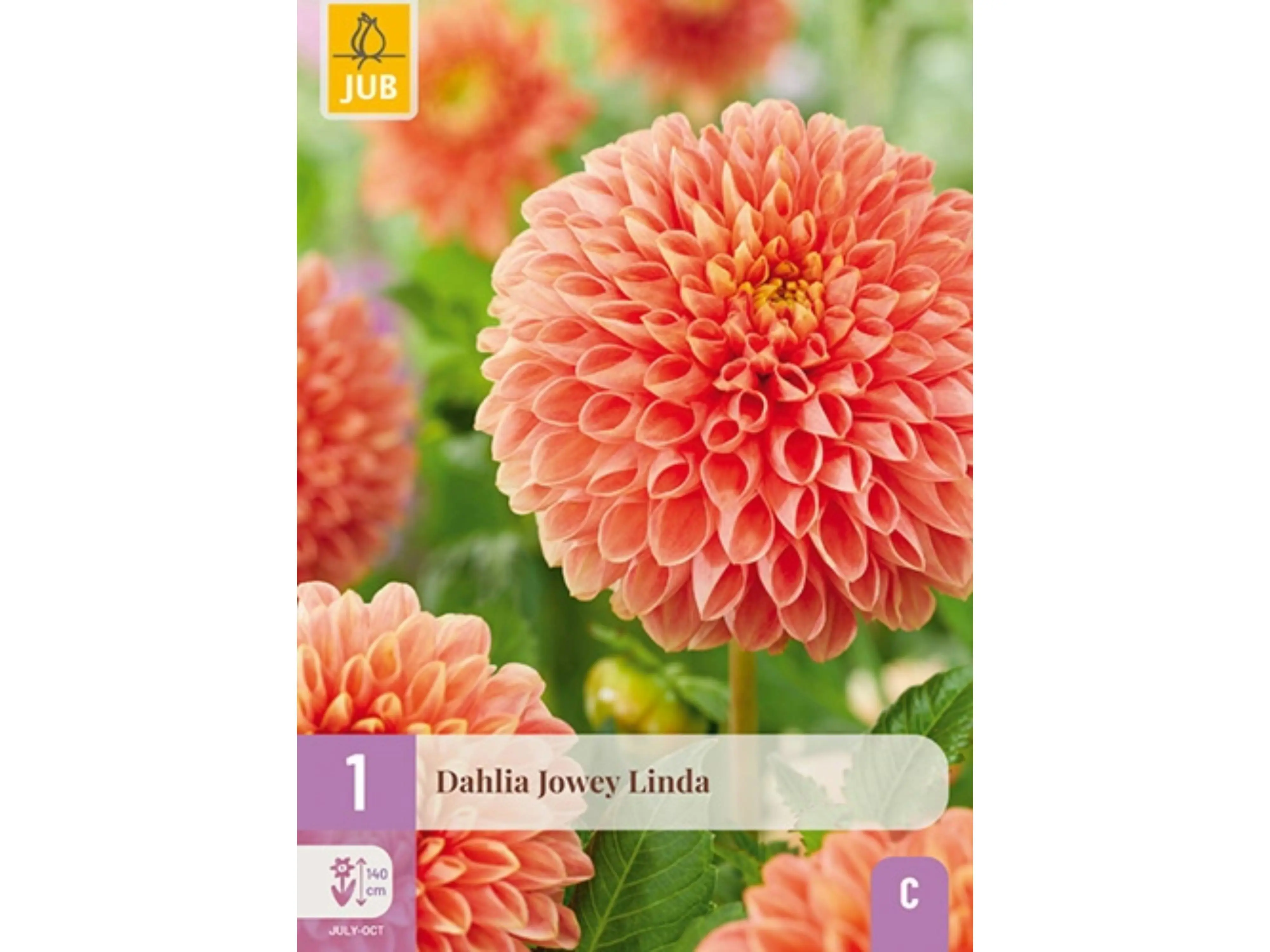 Dahlia ‘Jowey Linda’ bloeit uitbundig van juli tot de eerste nachtvorst. De plant bereikt een hoogte van ongeveer 130 tot 140 cm. Door de lange bloemstelen kan het bij wind of zware bloei nodig zijn om de plant licht te ondersteunen.