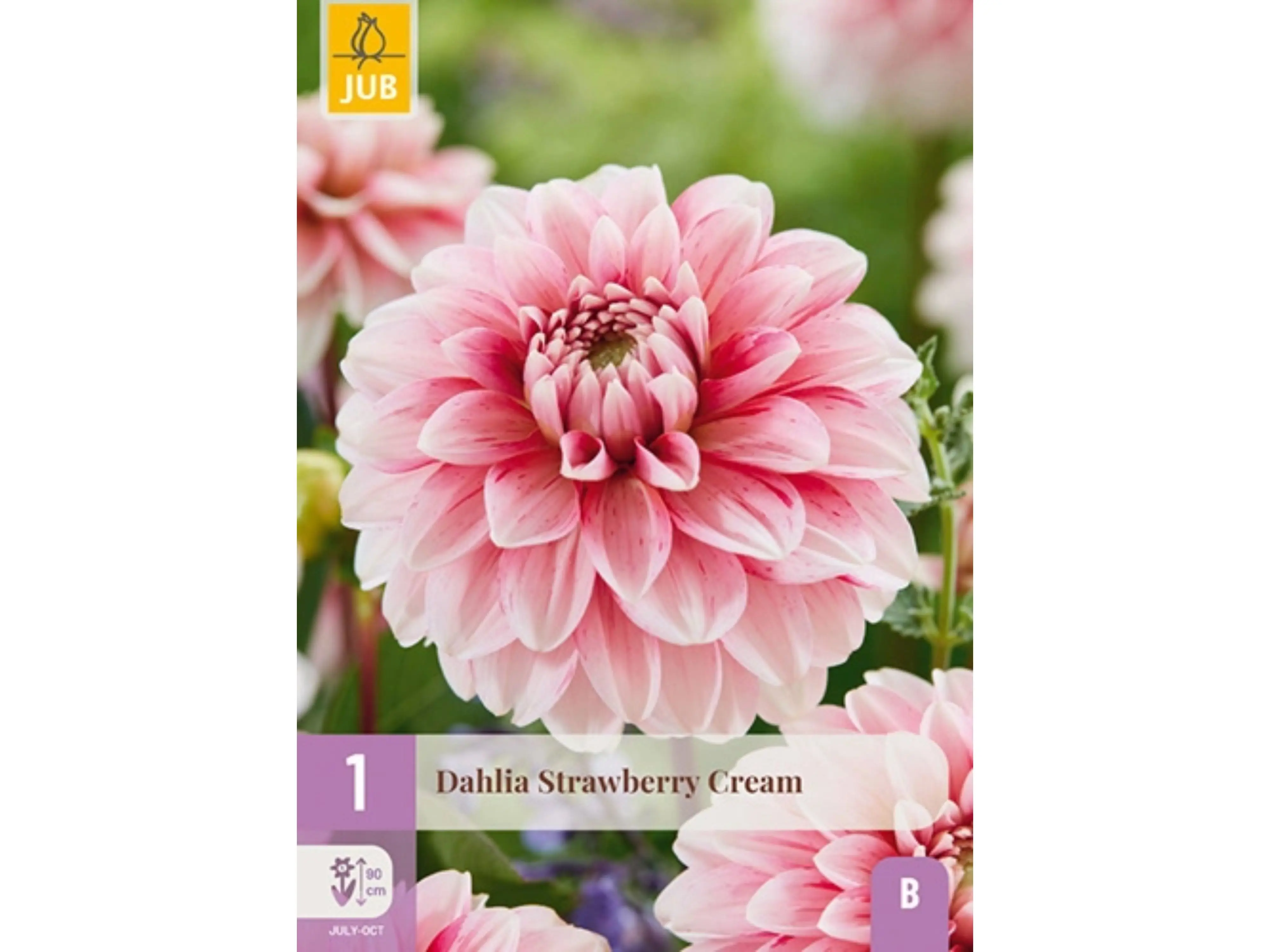 Breng kleur en elegantie in je tuin met de Dahlia Strawberry Cream. Deze grootbloemige decoratieve dahlia betovert met haar crème-roze, bolvormige bloemen en bloeit uitbundig van juli tot de eerste nachtvorst. Perfect voor borders, maar ook ideaal als snijbloem voor in huis.