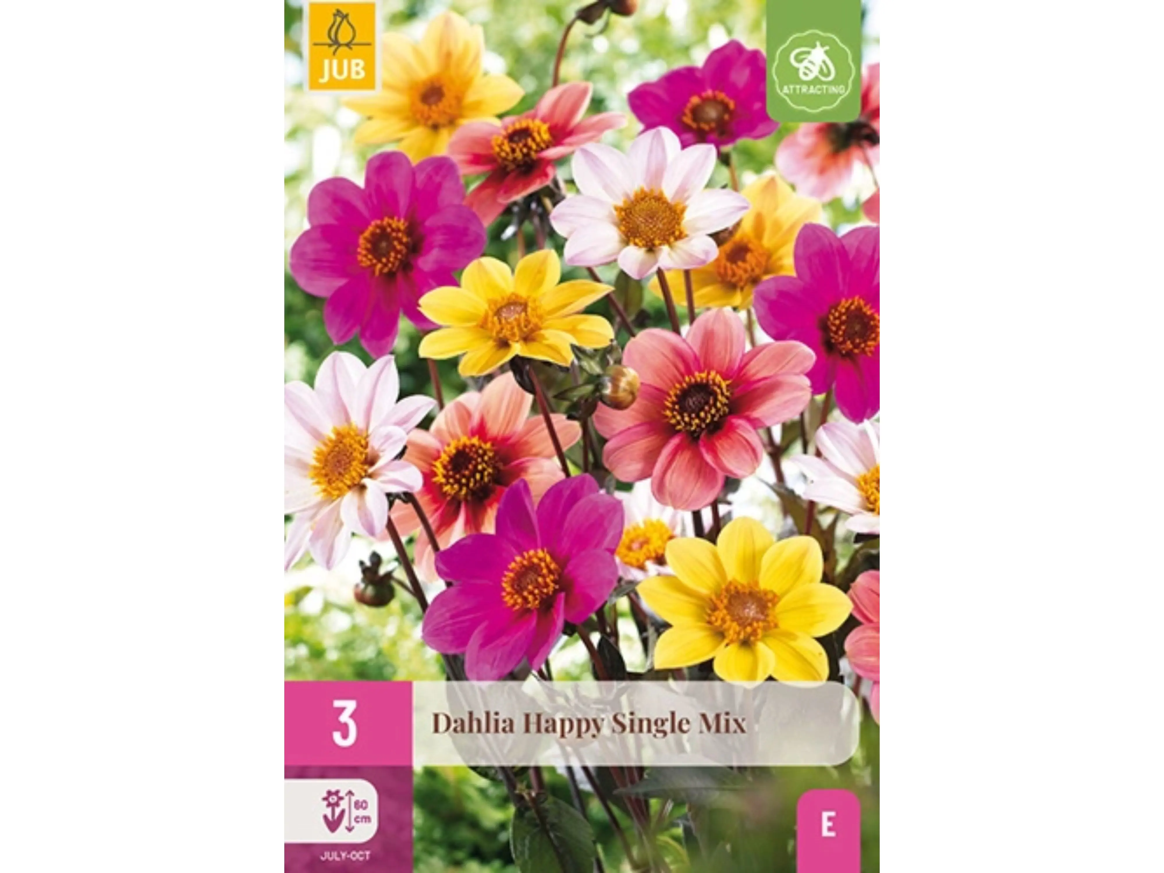 De dahlia mix ‘Happy Single Mix’ is een vrolijke zomerbloeier die maandenlang kleur en leven in de tuin brengt. Van juli tot de eerste nachtvorst verschijnen de bloemen in volle glorie. De planten worden ongeveer 60 cm hoog en bij zware bloei kan het nodig zijn de stelen te ondersteunen.
