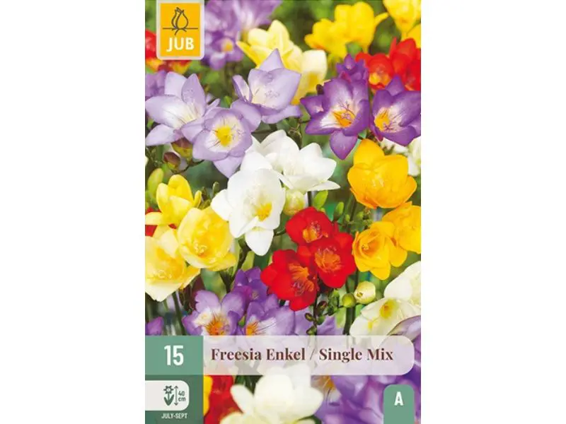 Freesia’s Enkel Mix verrast met enkelbloemige, heerlijk geurende bloemen in een speelse kleurenmix. Deze variëteit is makkelijk te kweken, bloeit rijk en is bovendien een uitstekende snijbloem. Ze laat zich ook prachtig combineren met andere zomerbollen.