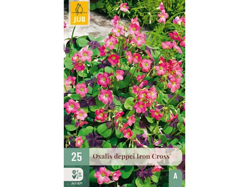 Plant deze Oxalis in het voorjaar op een diepte van ongeveer 5 cm. De bloeitijd loopt van mei tot oktober en de plant wordt zo’n 20 cm hoog. Oxalis deppei ‘Iron Cross’ is ideaal als bodembedekker in de border, maar doet het ook uitstekend in potten.