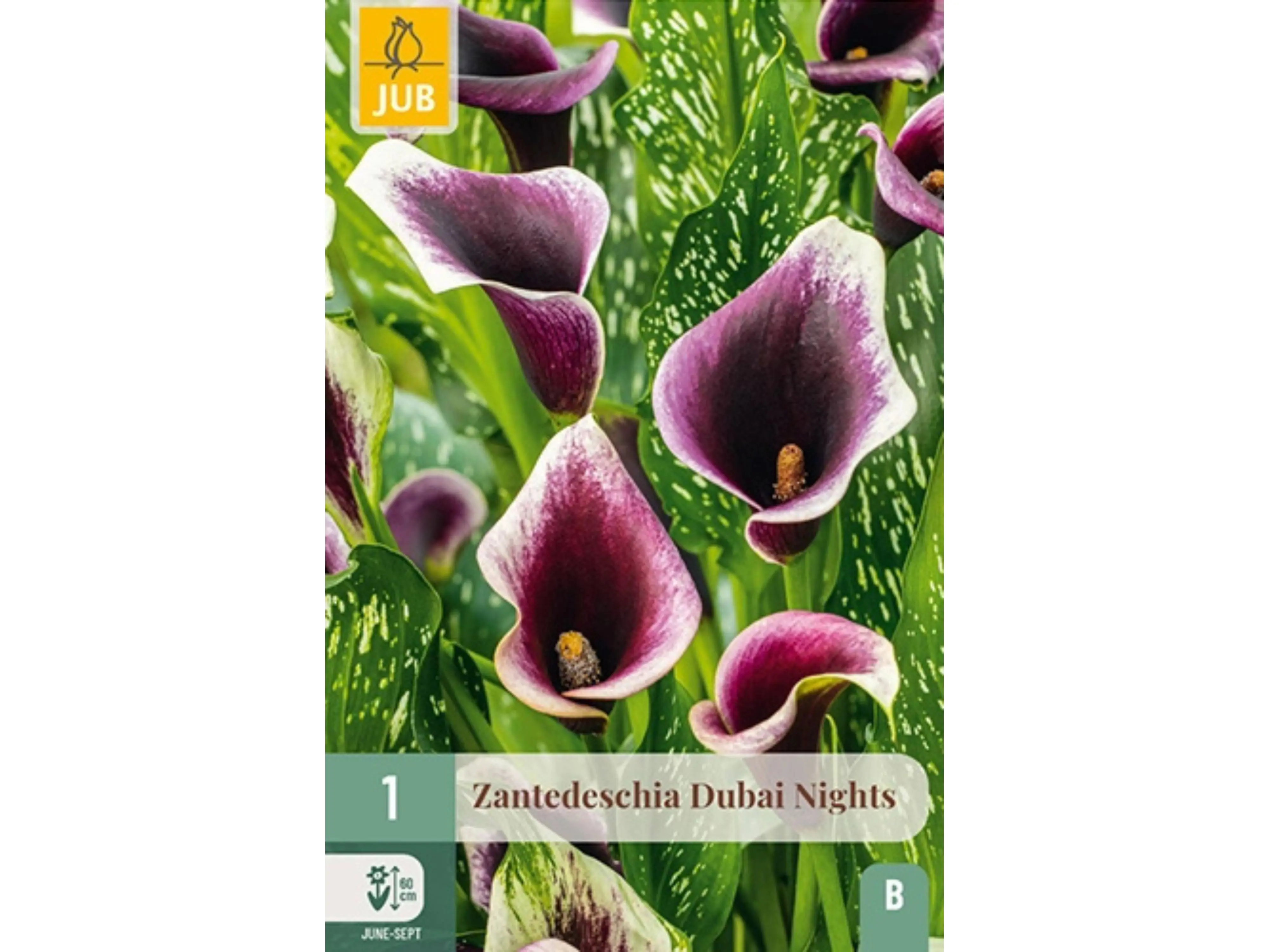 De bloemen van Zantedeschia Dubai Nights zijn fluweelpaars tot zwart van kleur met een crèmekleurige buitenrand. De stevige kelkvormige bloemen komen vantussen de gespikkelde bladeren tevoorschijn. De spikkels geven de plant een extra accent waardoor hij nog unieker oogt. Deze aronskelk blijft compact met een hoogte van ongeveer 60 cm en is ook zeer geschikt als snijbloem.