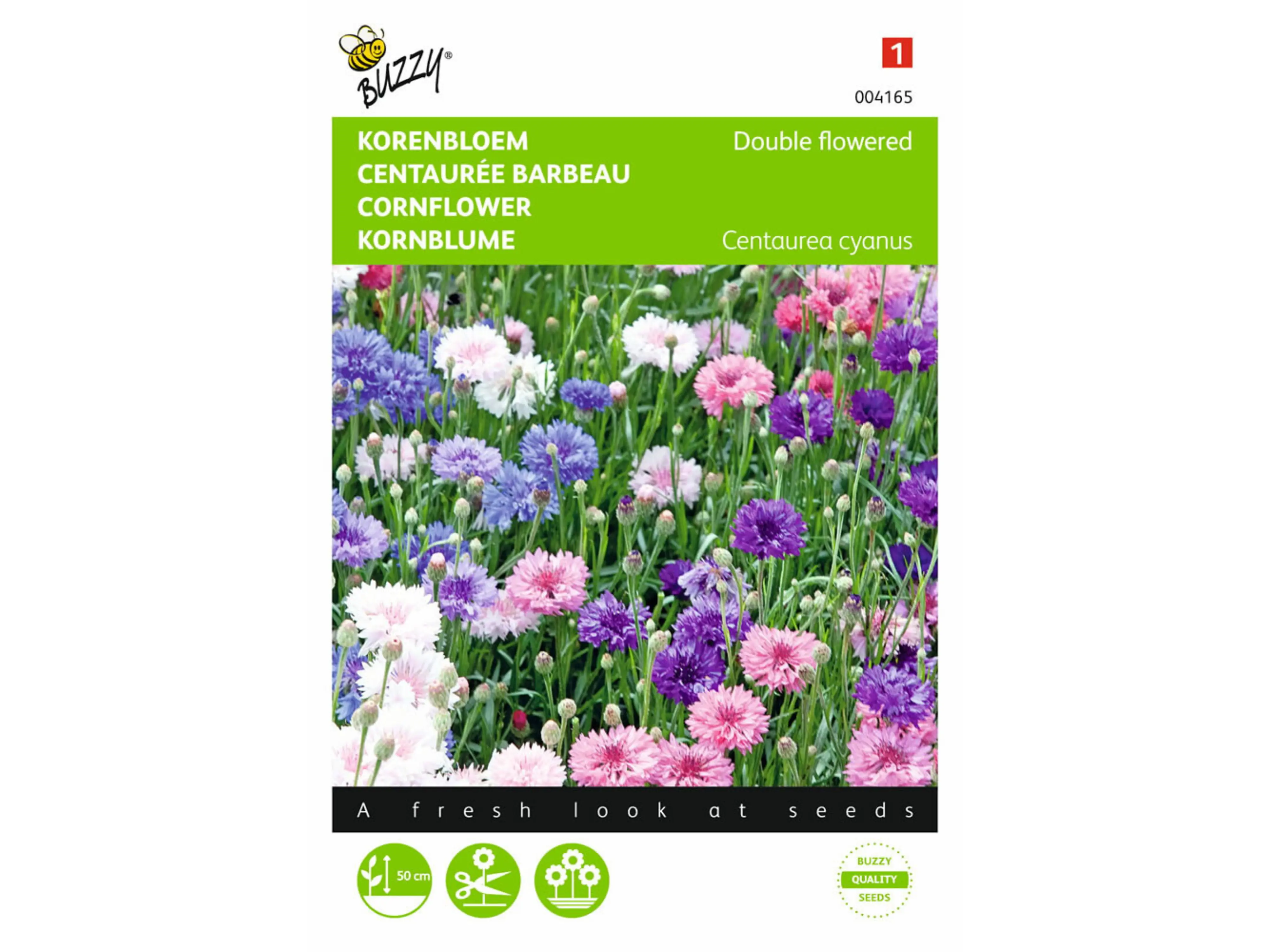 Korenbloem dubbelbloemig gemengd is een mengsel van korenbloemen in diverse tinten wit, roze en paars. De dubbele bloemen bloeien rijkelijk en zijn eenvoudig te kweken. Staat mooi in de border en de wildbloementuin.