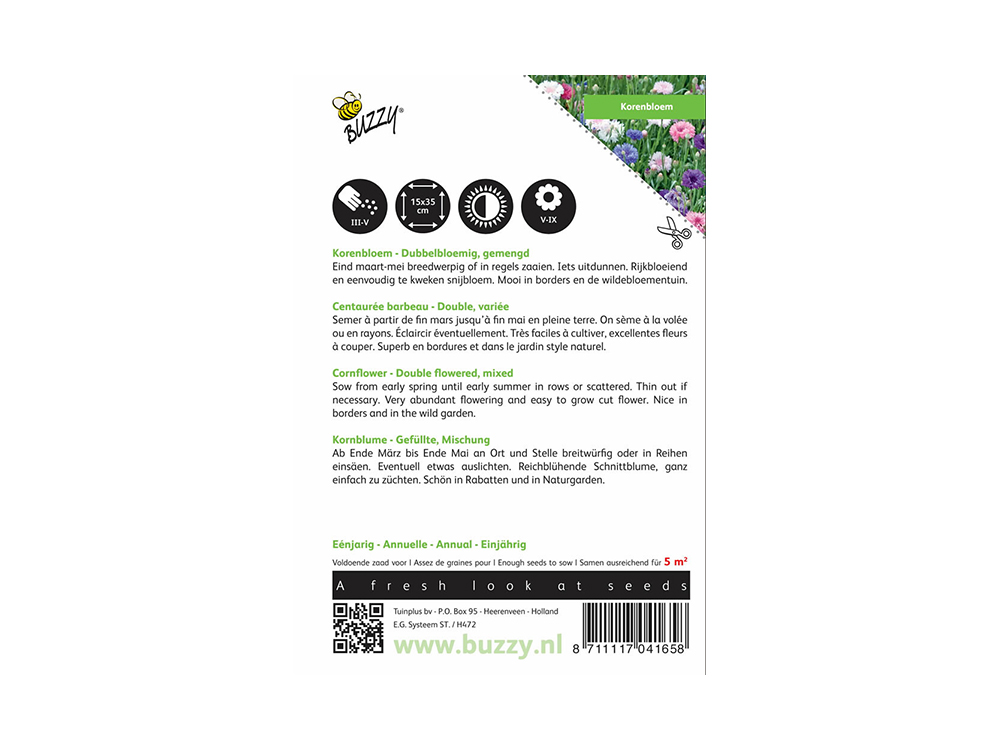 Korenbloem dubbelbloemig gemengd is een mengsel van korenbloemen in diverse tinten wit, roze en paars. De dubbele bloemen bloeien rijkelijk en zijn eenvoudig te kweken. Staat mooi in de border en de wildbloementuin.