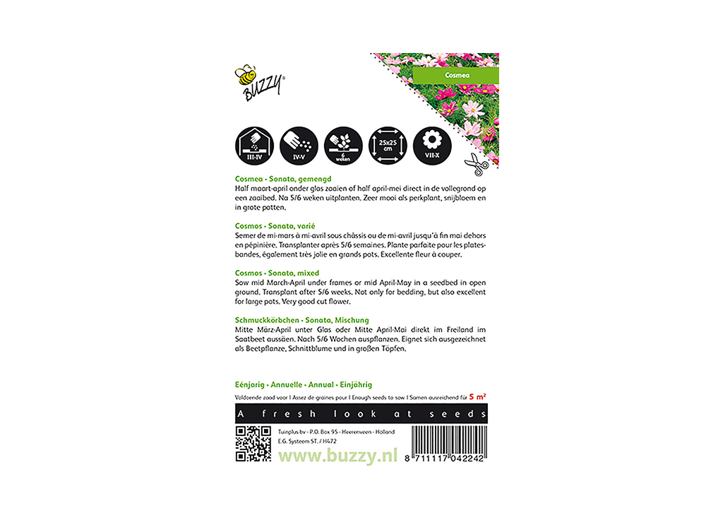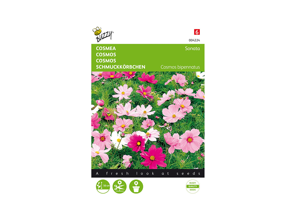 Cosmos Sonate van Buzzy Seeds, een éénjarige rijke bloeier die ook wel Cosmea wordt genaamd. Het zijn rijk en lang bloeiende éénjarige planten en opvallend goede, lang houdbare snijbloemen. De kokervormige bloemen zijn heel bijzonder. Cosmea houdt van zon.