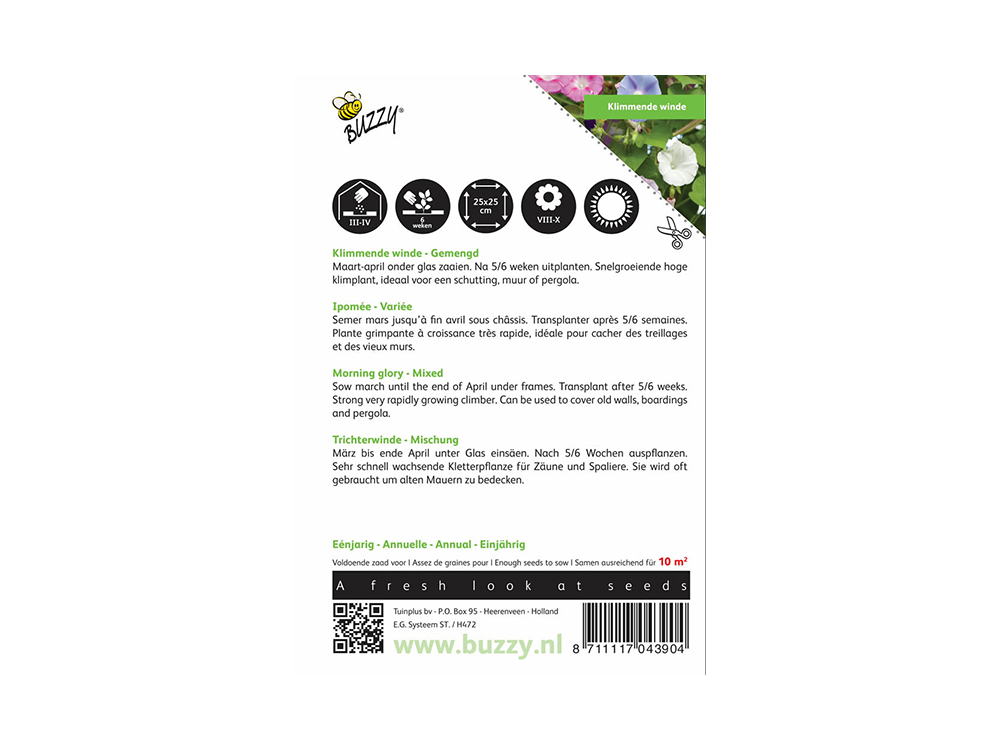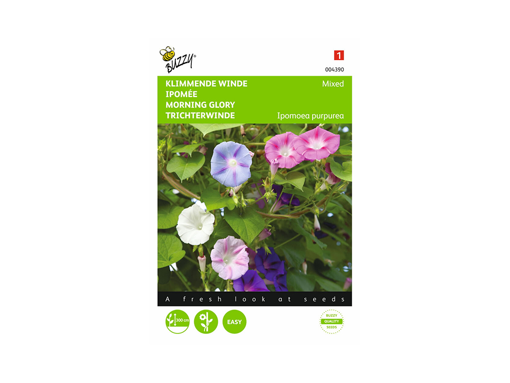 Klimmende winde gemengd, pronkwinde of dagbloem zijn allemaal namen voor deze schitterende bloeiende eenjarige klimplanten. De klimplant wordt gemakkelijk 3 meter hoog en bloeit fantastisch in witte, rose, rode, lila en purperen tinten. De bloemen zijn trechtervormig.