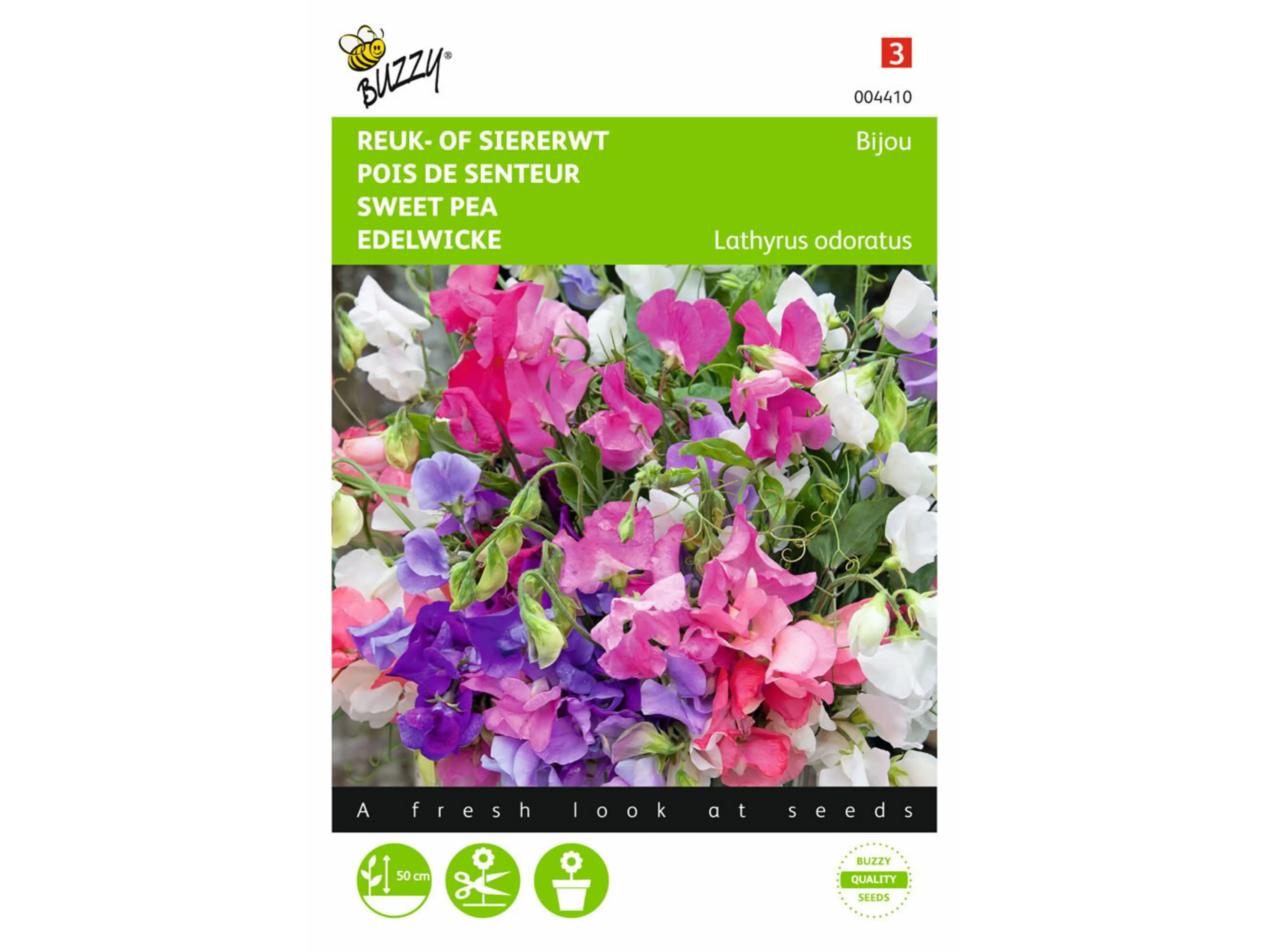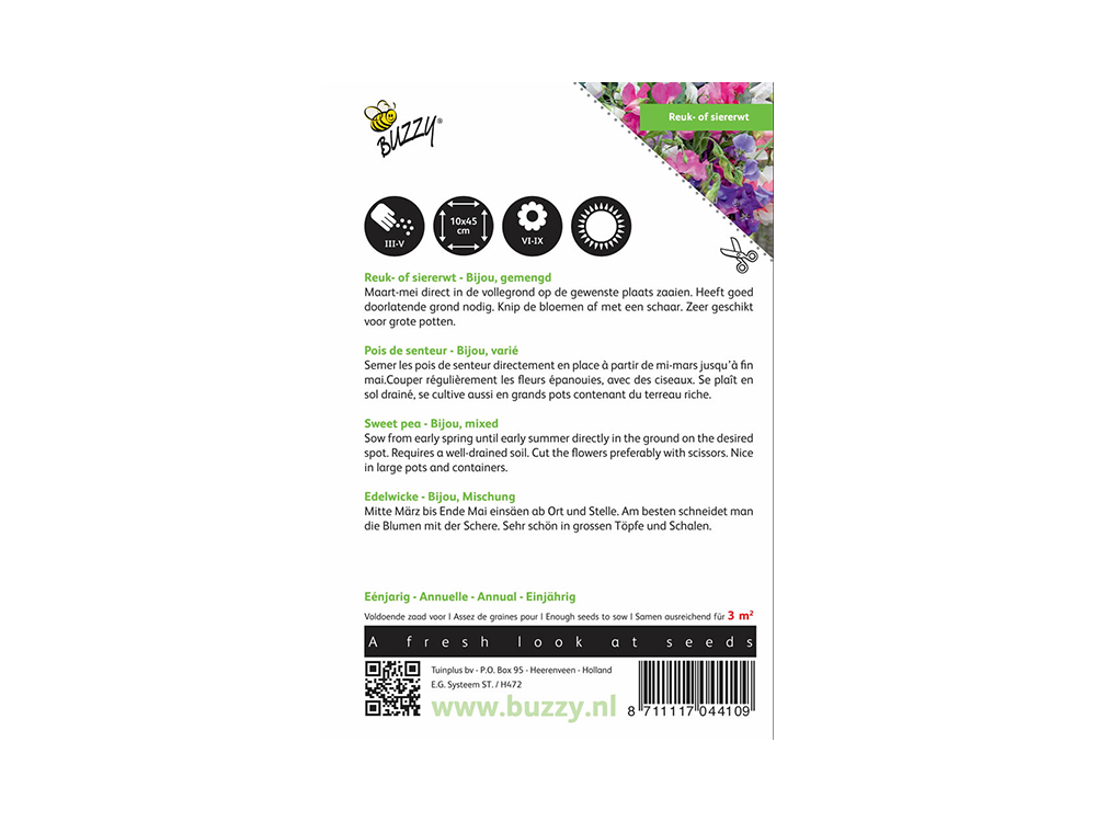 Reuk- of siererwt Bijou is een eenjarige siererwt die een heerlijke geur verspreidt. Dit rijkbloeiende, veelkleurige mengsel blijft laag tot 50 cm. Ook zeer geschikt voor grote potten.