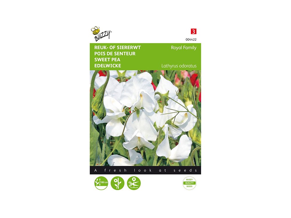 Reuk- of siererwt Royal Family wit bloeit zeer vroeg met een lange dikke bloemsteel en veel grote, witte bloemen. Het is een uitstekende snijbloem dien heerlijk geurt! De planten worden tegen een klimsteun gemakkelijk 2 meter hoog.