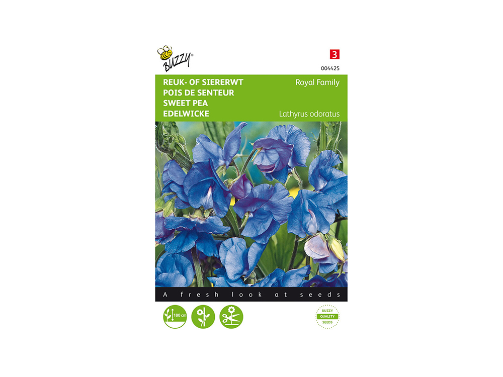 Reuk- of siererwt Royal Family blauw bloeit zeer vroeg met een lange dikke bloemsteel en veel grote, blauwe bloemen. Het is een uitstekende snijbloem. De plant wordt tegen een klimsteun gemakkelijk 2 meter hoog. Na opkomst eventueel iets uitdunnen.
