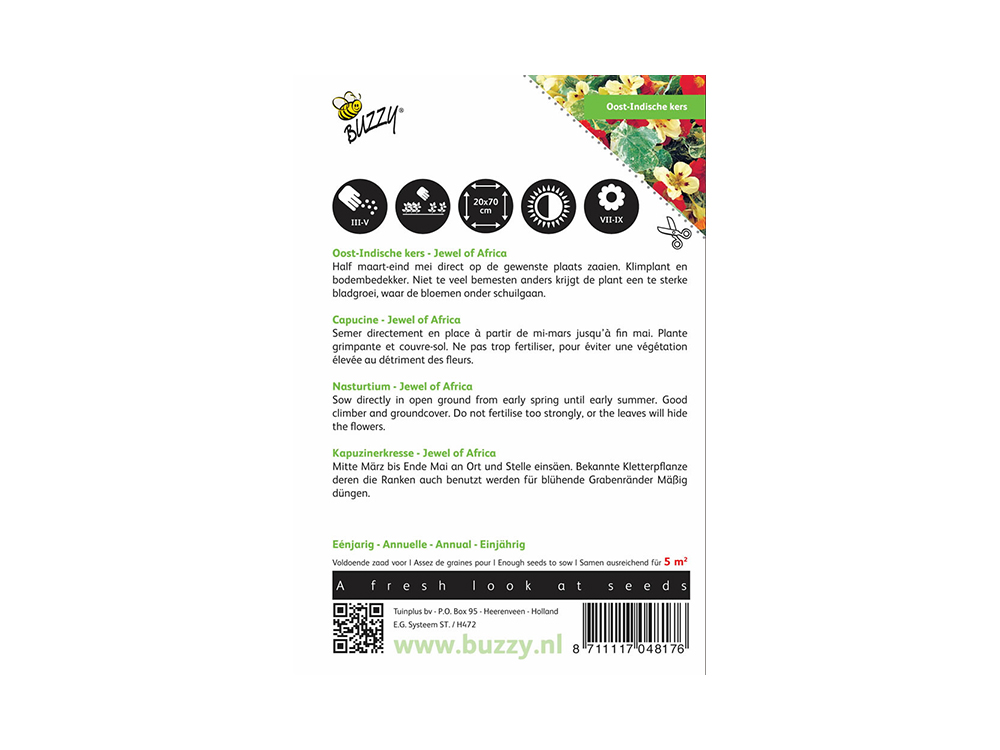 Wat 'Jewel of Africa' extra bijzonder maakt, zijn de witgemarmerde bladeren, die de plant nog decoratiever maken. In Nederland staat deze plant ook bekend als capucientjes of Oost-Indische kers.