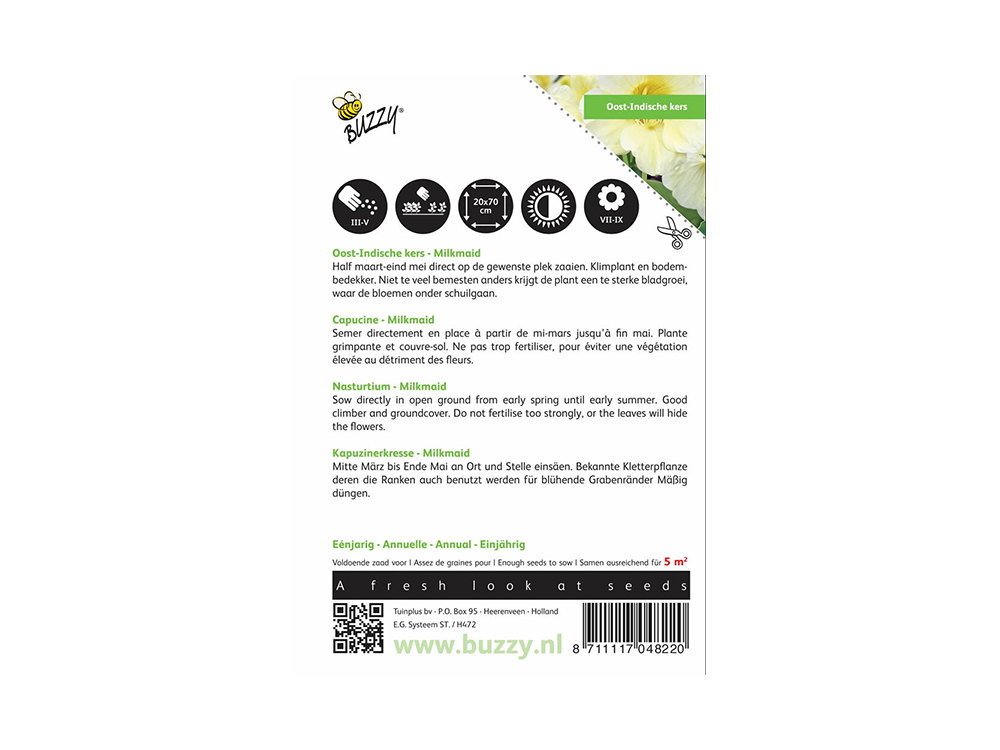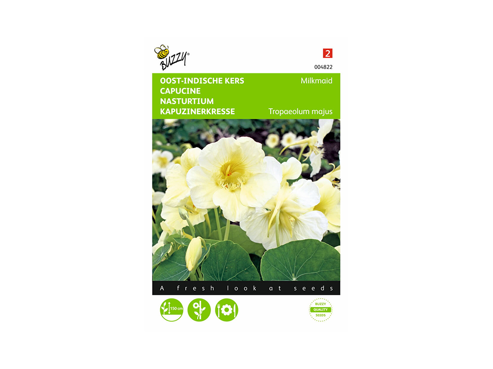 Oost Indische kers Milkmaid heeft prachtige roomwitte bloemen. De plant is een sterke klimmer en is dus ideaal om een saaie tuinmuur op te vrolijken. Je kan de plant natuurlijk ook als bodembedekker gebruiken. De plant heeft weinig verzorging nodig en stelt weinig eisen. De bloemen zijn eetbaar en kunnen dienen als garnering van gerechten, de zaden kunnen ingemaakt worden als kappertjes.