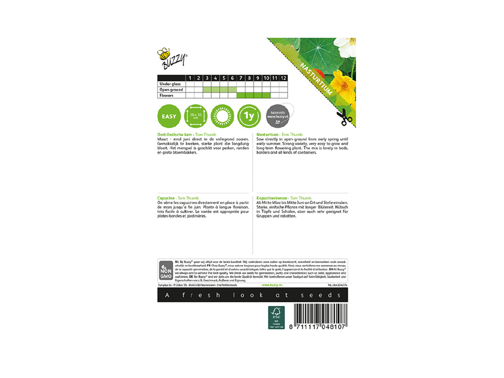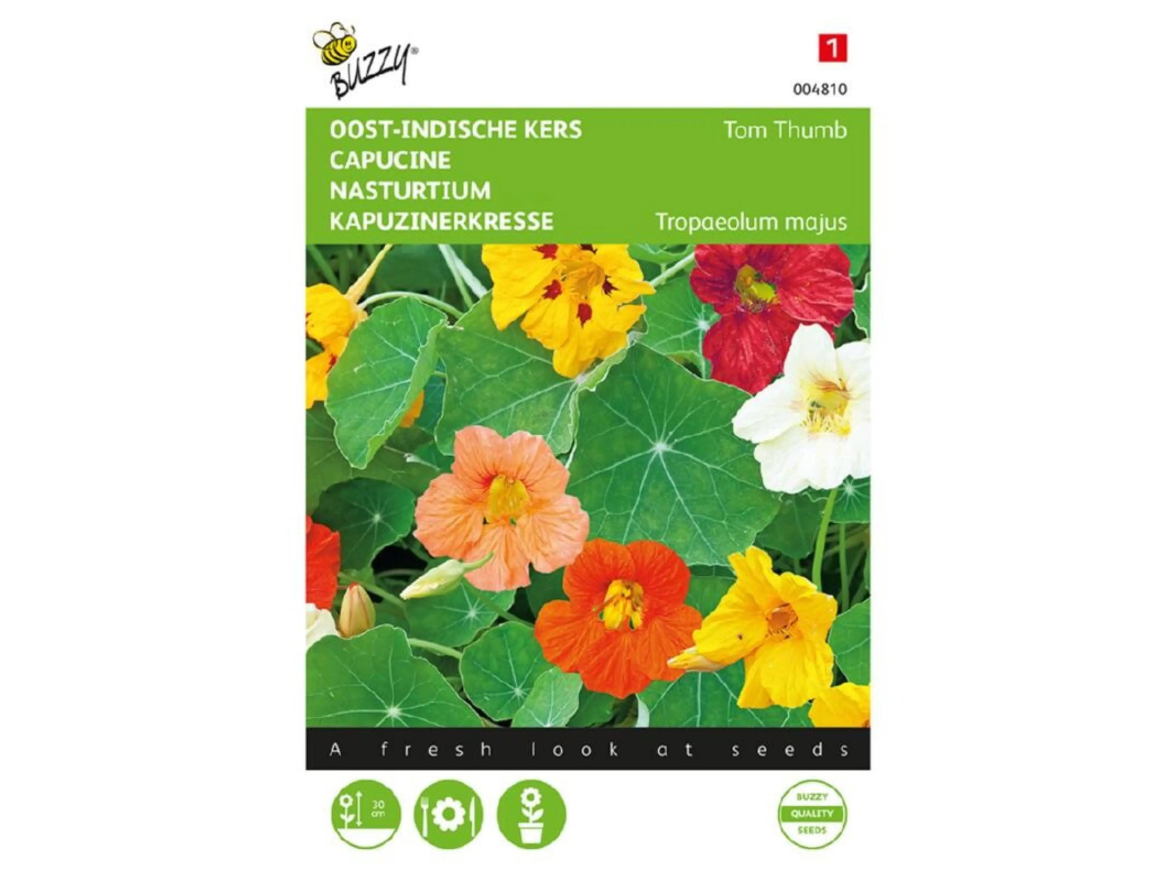 De Oost-Indische kers Tom Thumb is een laagblijvende cultivar. De plant krijgt weinig tot geen ranken en heeft bloemen die goed boven het blad uitkomen. De kleuren zijn vrolijk en fris. Laat ze op een zonnige plek in de tuin groeien. Ook geschikt voor grote bloembakken.