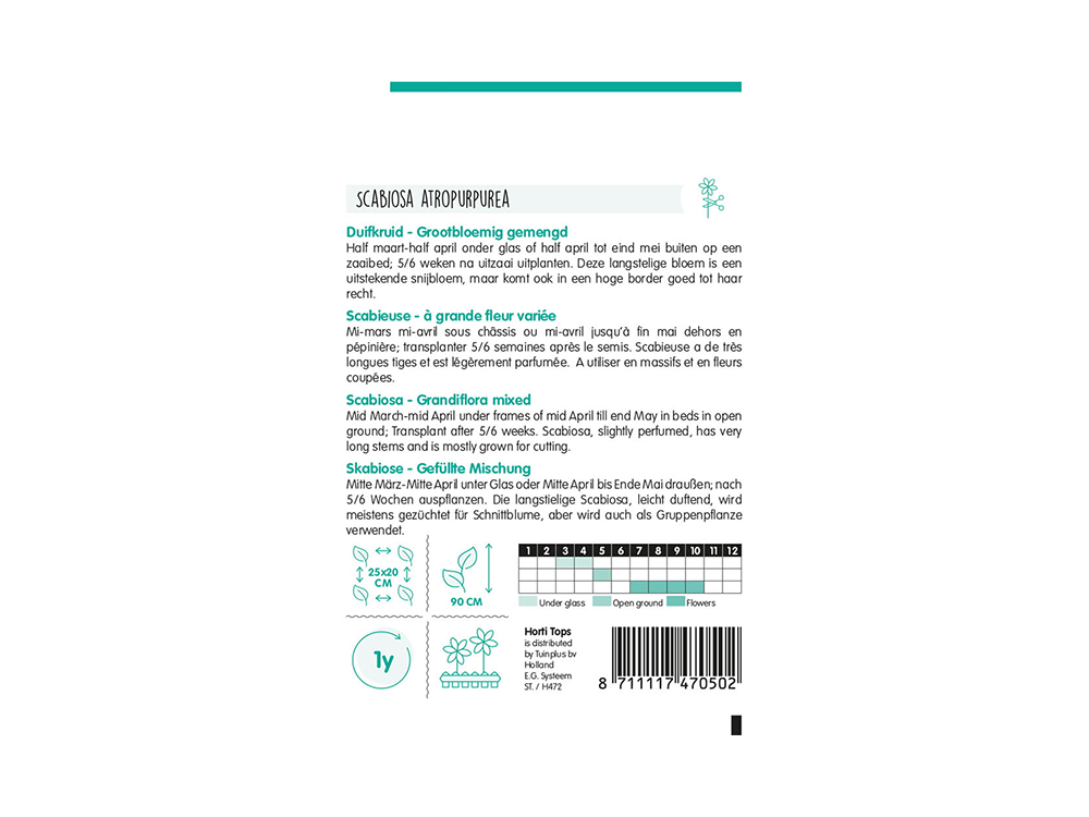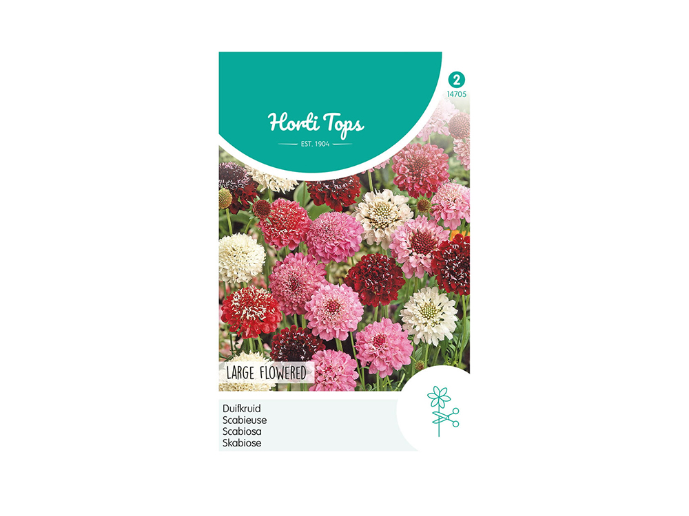 Zaai Scabiosa vanaf half maart/april onder glas of half april tot eind mei buiten op een zaaibed. Plant 5 à 6 weken na het zaaien uit.