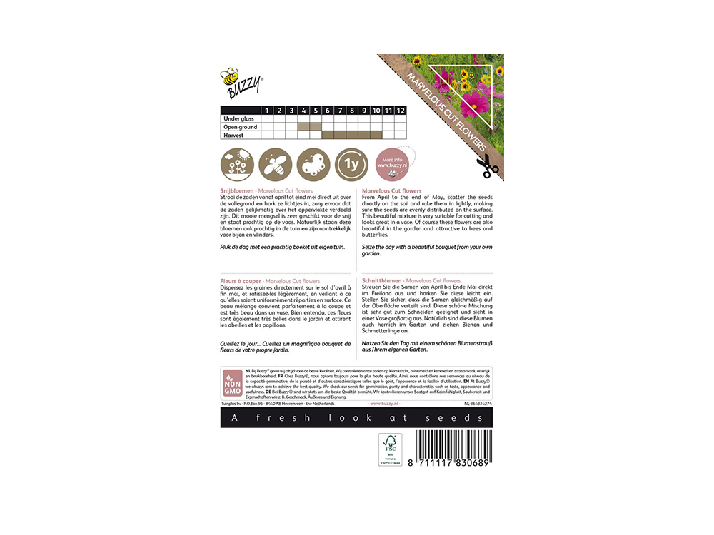 Een zeer gevarieerd bloemenmengsel met verschillende soorten snijbloemen die mooi staan in een vaas. Zo kan je elke dag een mooi boeket maken uit eigen tuin! Natuurlijk staan deze bloemen ook prachtig in de border en zullen ze heel wat bijen en vlinders naar de tuin lokken.