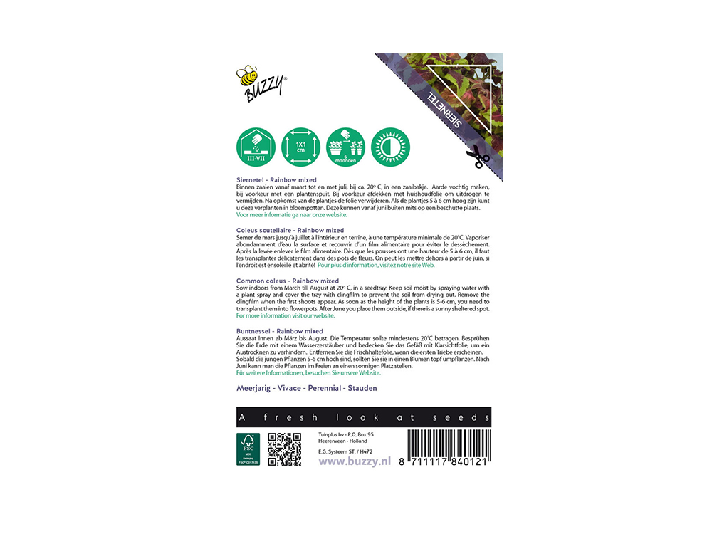 Kamerplant Coleus is vanaf maart tot en met juli op te kweken bij ca. 20 C in een zaaibakje of bloempot. Waneer de plantjes circa 5-8 cm groot zijn moet je uitplanten in grotere potten. Zo kan de siernetel optimaal blijven groeien. Bij te snelle groei knip je de toppen er best uit. Vermijd felle zon om verbranding van de bladeren te voorkomen.