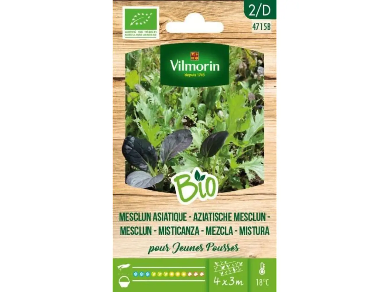 Kweek je eigen smaakvolle kropsla, geheel biologisch met de kwalitatieve zaden van Vilmorin. Aziatische Mesclun is een mengsel van verschillende soorten Chinese kool, rode mosterd en mizuna geeft een Aziatische toets aan salades. De blaadjes worden in een vroeg stadium geoogst.
