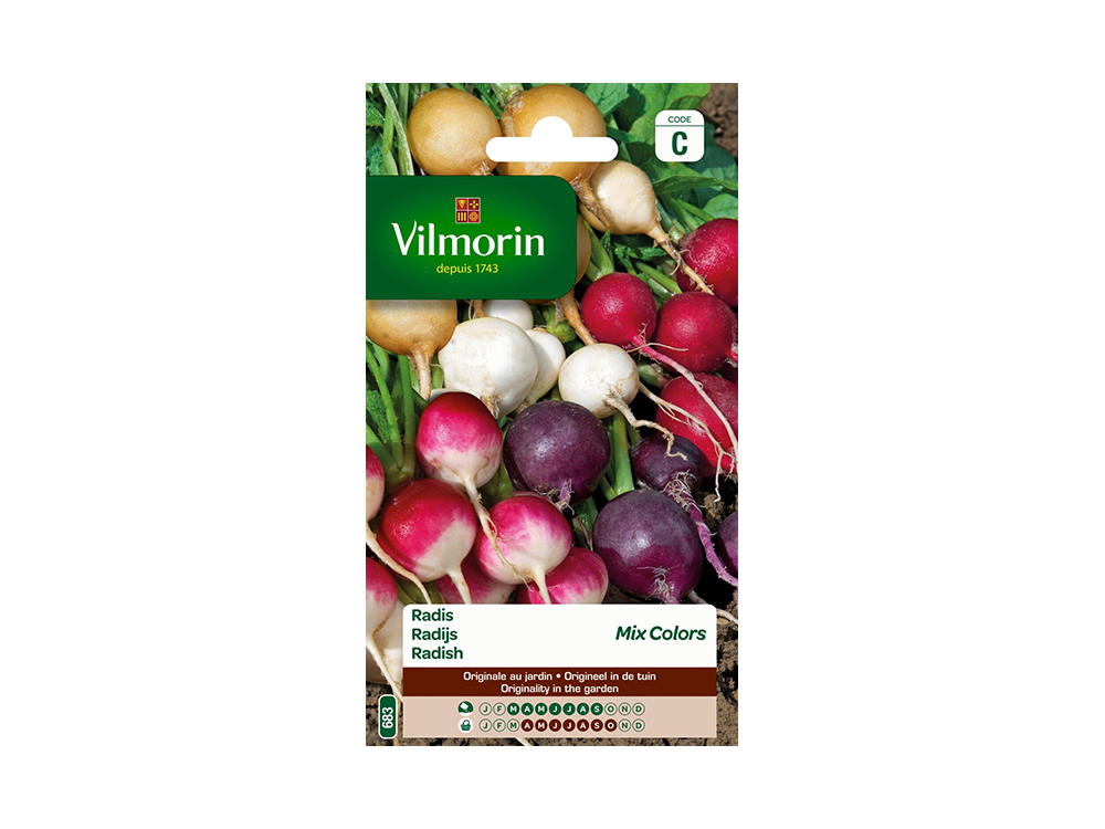 Dit mengsel van verschillende variëteiten ronde radijsjes is zeer origineel in de tuin. Ideaal voor het presenteren van schotels met verschillende kleuren radijsjes.