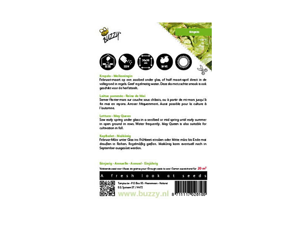 Kropsla Meikoningin is een heerlijke, malse kropsla met een mooie kleur. Het ras is speciaal geschikt voor de vroege teelt in de vollegrond. Te zaaien van maart tot april (niet later), direct in de vollegrond. Zaai op vochtige grond op regels (of rijen) met een onderlinge afstand van 30 cm of op een zaaibed. Ondiep zaaien, het zaad moet maar net zijn bedekt. Na opkomst uitdunnen op 30 cm in de regel (het teveel aan planten ertussen wegnemen) of uitplanten op 30 x 30 cm.