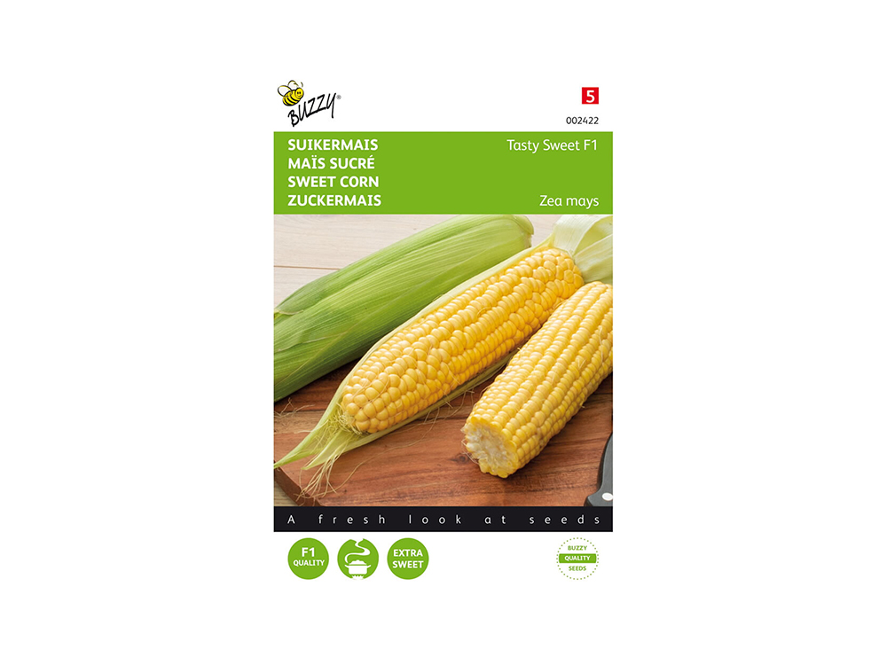 Zaden Suikermaïs tasty sweet F1 hybride zaaien voor een vroege oogst: eind april in een zaaibakje onder glas. Dit gaat het best als je perspotjes gebruikt. Neem potjes van 4 cm doorsnee. Drie weken na het zaaien kan je uitplanten op rijen of regels die 70 cm uit elkaar liggen. Kies hiervoor een zonnige plaats. Houd in de rij 20 cm afstand tussen de planten. Begin mei kan je direct in de volle grond zaaien (op rijen met 70 cm tussenruimte). In de rij later uitdunnen (het teveel aan planten wegnemen) zodat de ruimte tussen de resterende planten 20 cm bedraagt. Voor extra zoete maïs is een bodemtemperatuur van 18°C nodig.