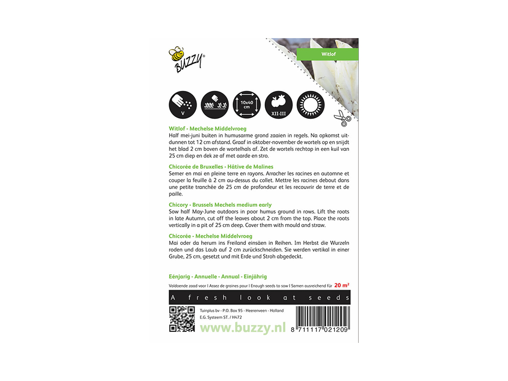 Zaai Witlof Mechelse Middelvroeg in mei buiten op regels. Graaf in de herfst de wortels op, snijd het blad tot 2 cm boven de kruin af, en zet de wortels rechtop in een 25 cm diepe kuil. Dek af met aarde en stro, eventueel onder glas.