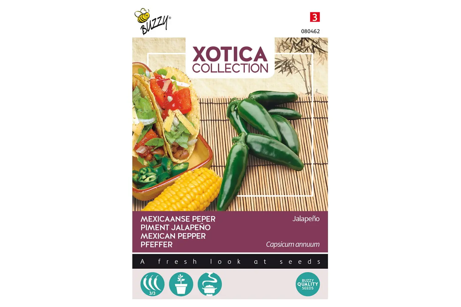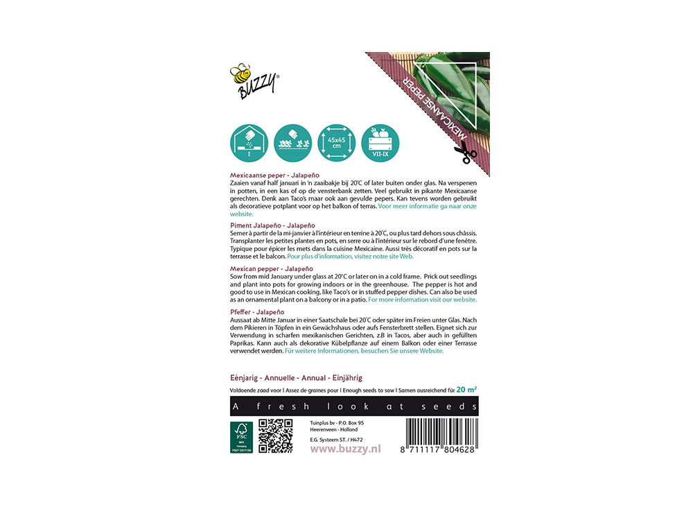 Mexicaanse peper Jalapeno wordt veel gebruikt in pikante Mexicaanse gerechten. Denk aan taco’s maar ook aan gevulde pepers. Kan tevens worden gebruikt als decoratieve potplant voor op het balkon of terras.