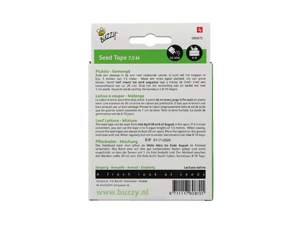 Zoek een plaatsje in de tuin met voldoende ruimte. Je kan het lint ook knippen in bijvoorbeeld 5 stroken van 1,5 meter. Maak een mooi egaal zaaibed, vrij van grove kluiten. Vanaf half maart tot begin augustus leg je hierop de linten met een tussenafstand van ongeveer 20 cm. Druk het lint zachtjes aan en bedek met 1 cm aarde. Houd de aarde vochtig. De kiemduur is ongeveer 8 à 10 dagen.