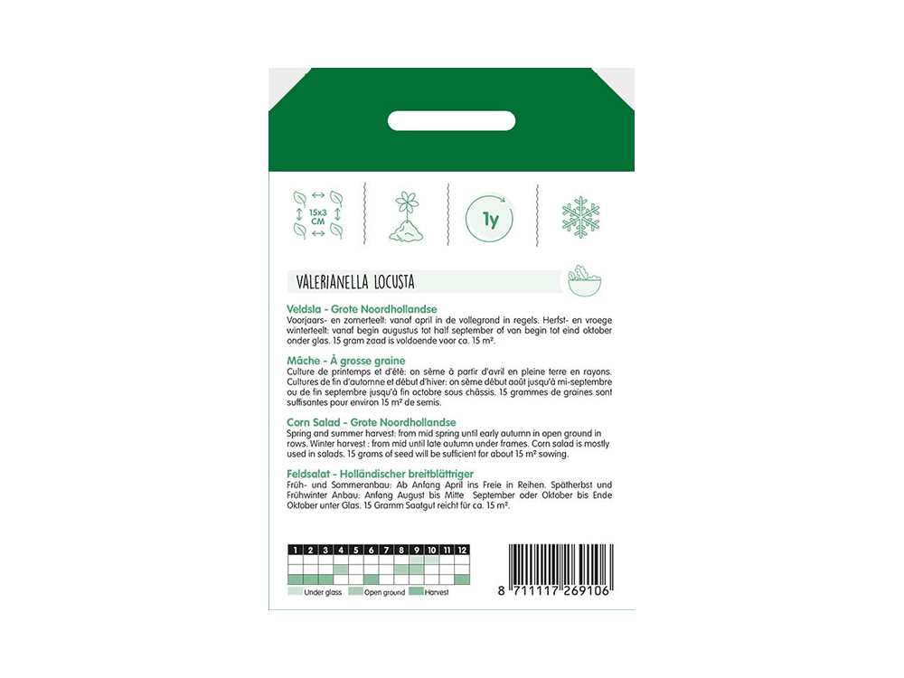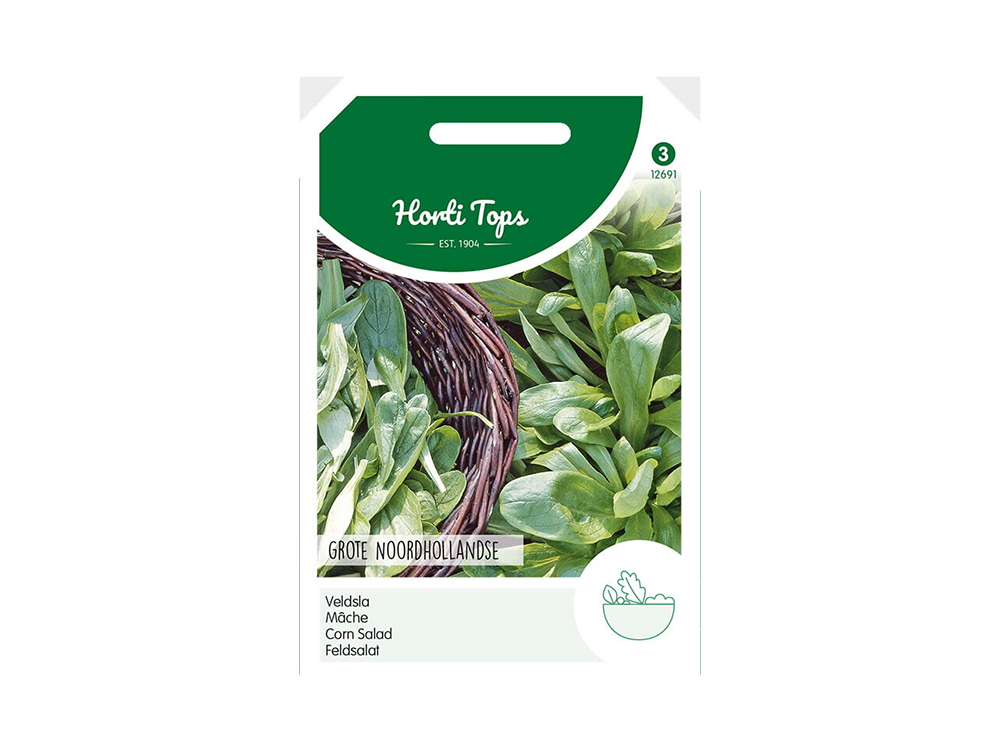Zaden Veldsla grote noordhollandse zaaien: voorjaars- en zomerteelt vanaf begin april buiten, op een beschutte plaats, in regels met 12-15 cm tussenruimte. Voor de late herfstteelt wordt vanaf begin augustus tot half september nog buiten in de volle grond gezaaid, maar voor de winterteelt vanaf eind september tot eind oktober onder glas. In het laatste geval zaait men breedwerpig. Veldsla altijd dicht zaaien en niet uitdunnen. De plantafstand moet ongeveer 3 à 4 cm zijn. Na het zaaien het zaad licht inharken en de grond aandrukken. Het zaaibed dient goed vochtig gehouden te worden.