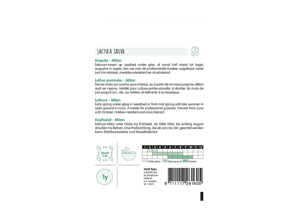 Kropsla Milan kan je zaaien vanaf februari/maart onder glas, vanaf half maart tot begin augustus in de vollegrond in regels. Een echt ras voor de professionele kweker, meeldauwresistent en virustolerant.