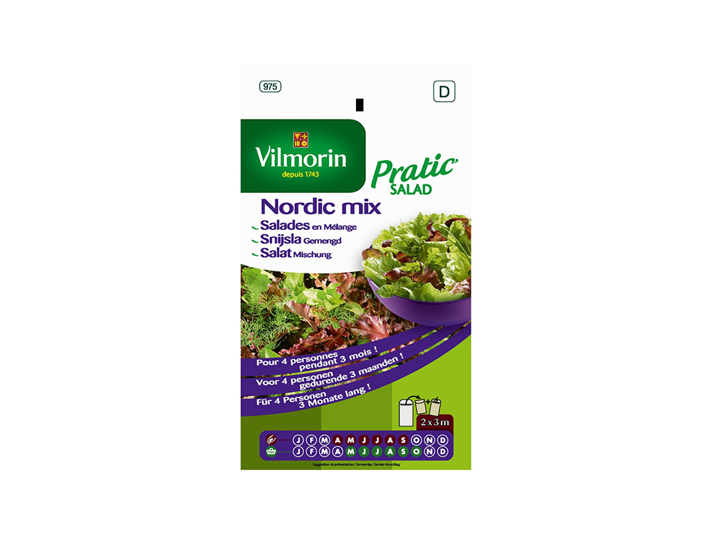 Pratic Salad Nordic mix is een kleurrijk mengsel van sla, dille en basilicum dat fijnproevers kan bekoren. De verschillende variëteiten kunnen gelijktijdig gezaaid en geoogst worden. De blaadjes worden geoogst tot net boven de kraag.