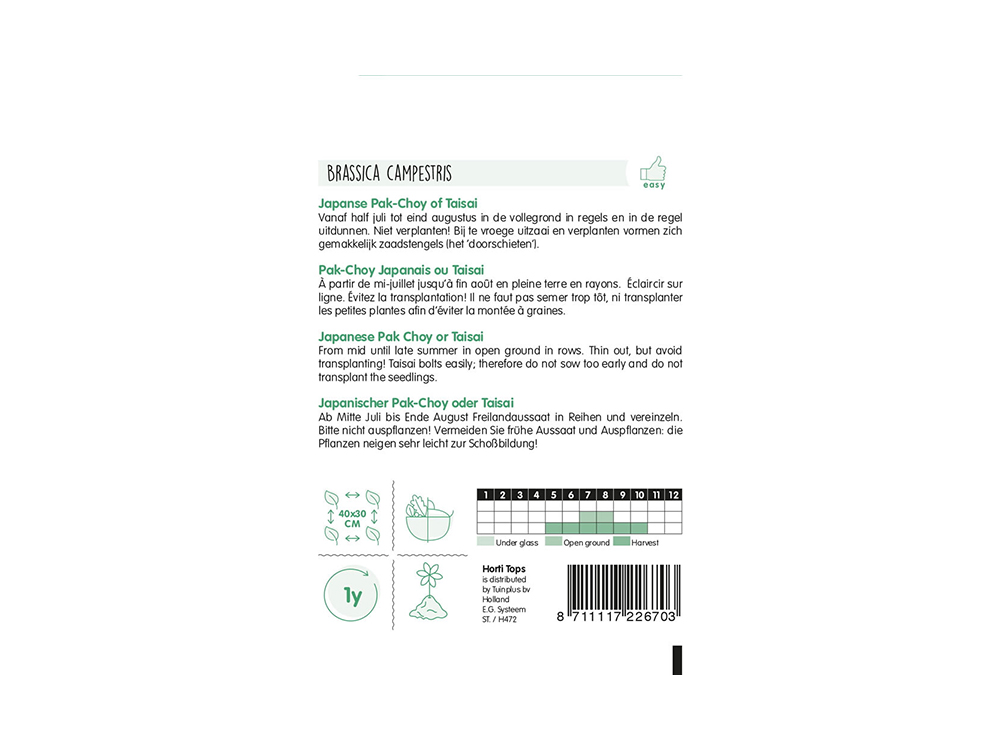 Zaai Japanse Pak-Choy of Taisai vanaf half juli tot eind augustus in de vollegrond in regels zaaien en dun in de regel uit. Niet verplanten! Bij een te vroege uitzaai en verplanten vormen zich gemakkelijk zaadstengels (doorschieten).