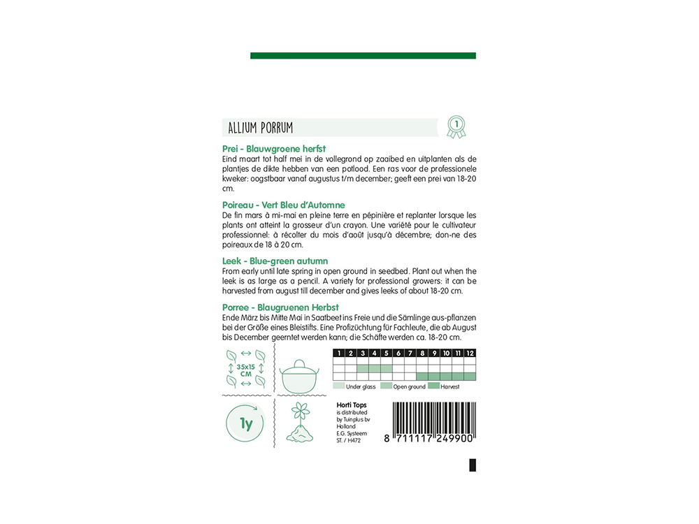 Prei Blauwgroene Herfst Ideal is echt een ras voor de professionele kweker. Geeft een prei van 18-20 cm.