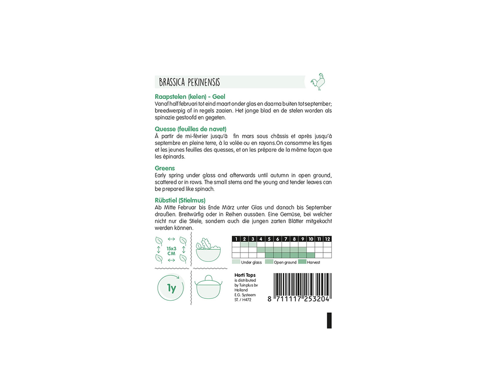 Zaai vanaf half februari tot eind maart onder glas zaaien en daarna buiten tot september, breedwerpig of in regels.