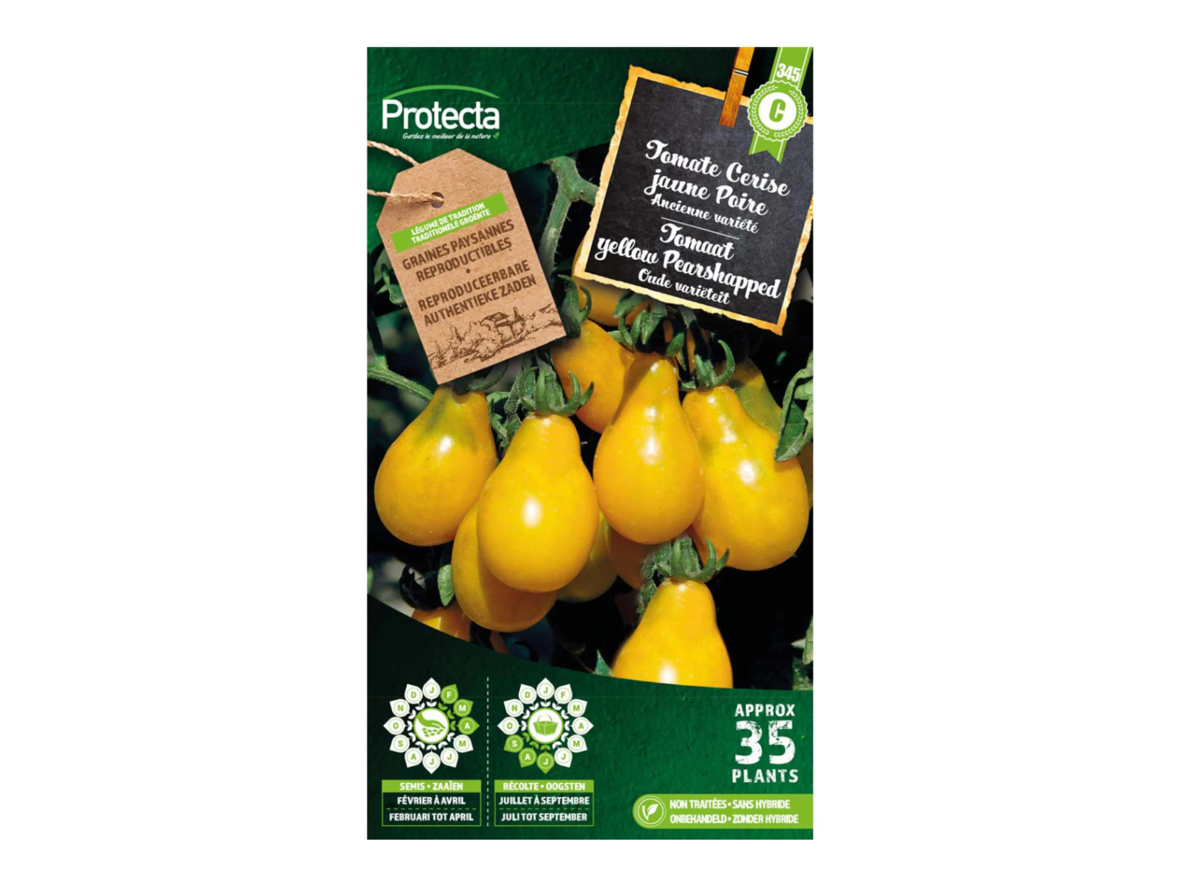 Tomaat yellow Pearshaped, een oude, betrouwbare variëteit met een hoog rendement. Deze tomatenplant produceert mooie, gele, peervormige kerstomaatjes met een zoete smaak. Ideaal als aperitiefhapje en zeer geschikt voor teelt in potten.