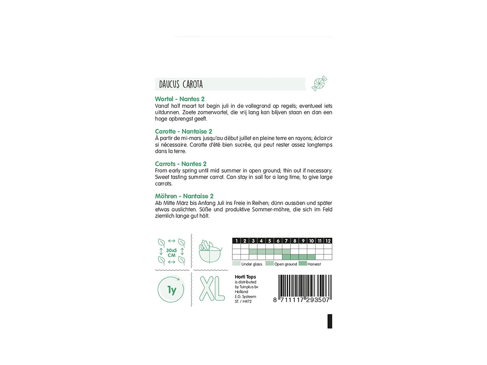 Wortelen Nantes 2 Halflange geeft tamelijk lange en slanke zomerwortelen met een mooie kleur en vorm. Ze zijn heel gelijk van vorm en heerlijk zoet. Nantes verdraagt iets drogere grond beter dan andere rassen. De planten vormen tamelijk veel loof.