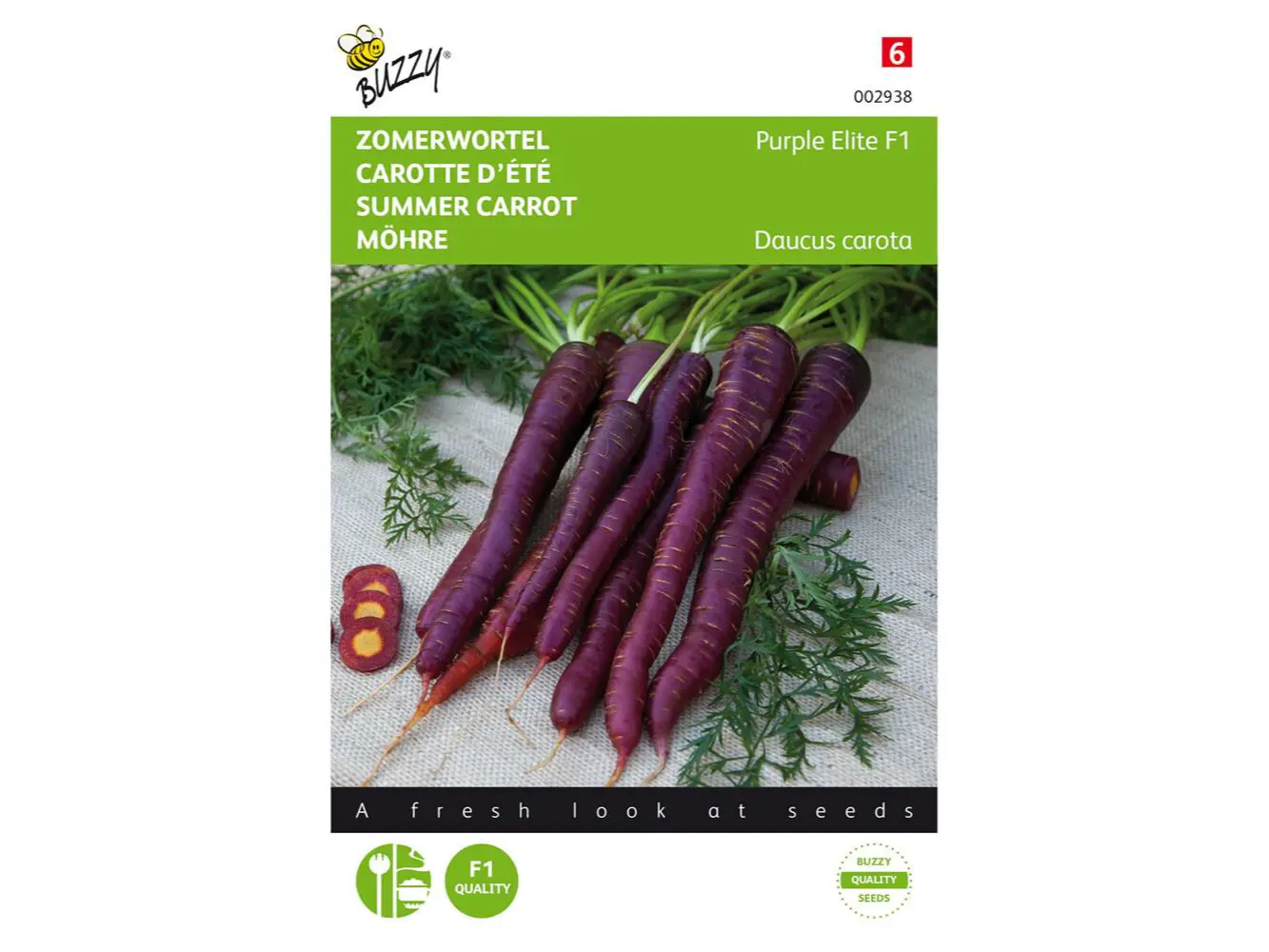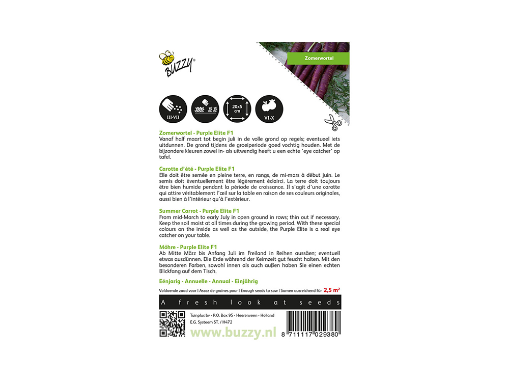 Zomerwortel Purple Elite F1 is een mooie paarse wortel die met zijn bijzondere kleur zowel in- als uitwendig een echte eyecatcher is op het bord. Het is een hybride ras met wortels die stevig zijn van structuur.