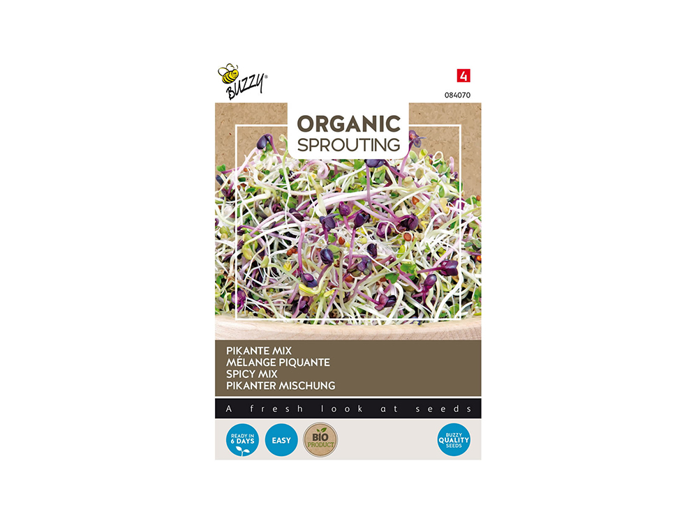 Pikante Mix Bio kan het hele jaar door gekweekt worden als spruitgroente in een sprouting pot. Het is een mengeling van rode daikon (Japanse radijs), rucola, broccoli en fenegriek. De kiemspruiten hebben een rijke en pittige smaak, ze zitten boordevol vitaminen en mineralen en zijn dus een waardevolle aanvulling bij veel gerechten.