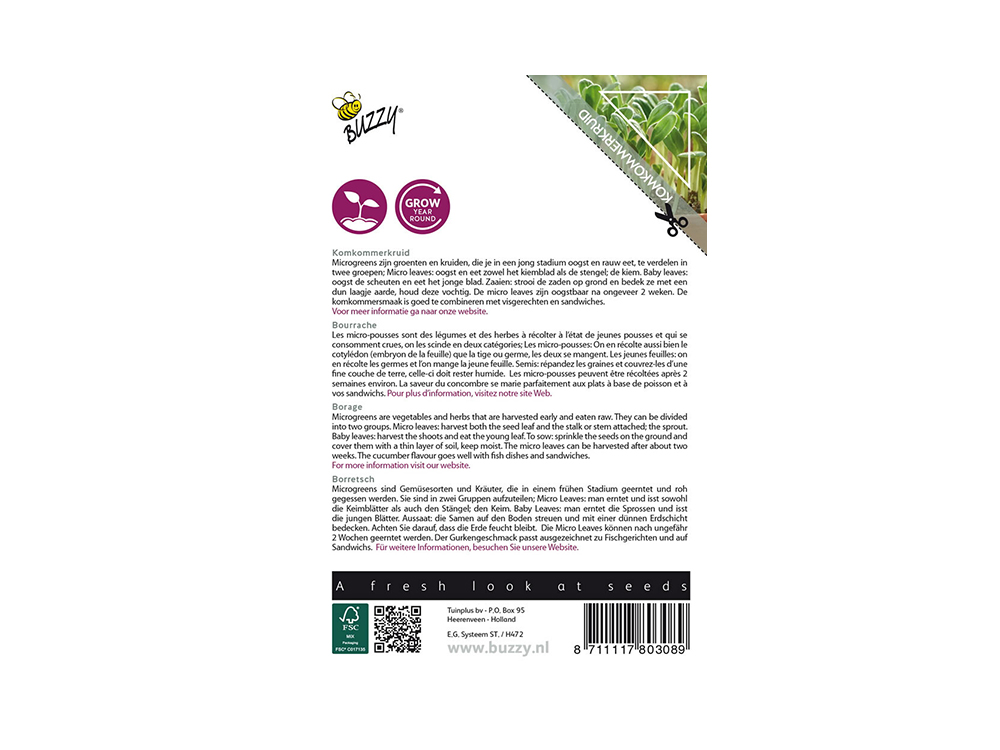 De micro leaves zijn oogstbaar na ongeveer 2 weken. De komkommersmaak is goed te combineren met visgerechten en sandwiches. De mooie blauwe bloemen zijn geschikt als garnering.