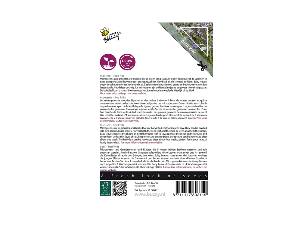 Mosterd Red Frills is een pittige microgreen met een aantrekkelijke kleur, oogstbaar als kiemplant na één week of als babyleaf na 4 weken. Ideaal voor in salades.