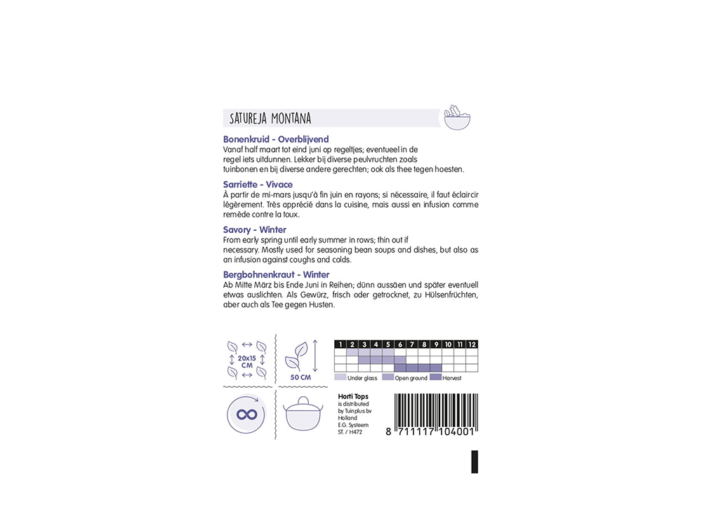 Bonenkruid Overblijvende is een ideaal kruid voor gerechten met peulvruchten. Het wordt ook gebruikt om soepen en sauzen op smaak te brengen of toe te voegen aan azijn op fles. Het is een overblijvende vaste plant met paars, rode tot witachtige bloemen.