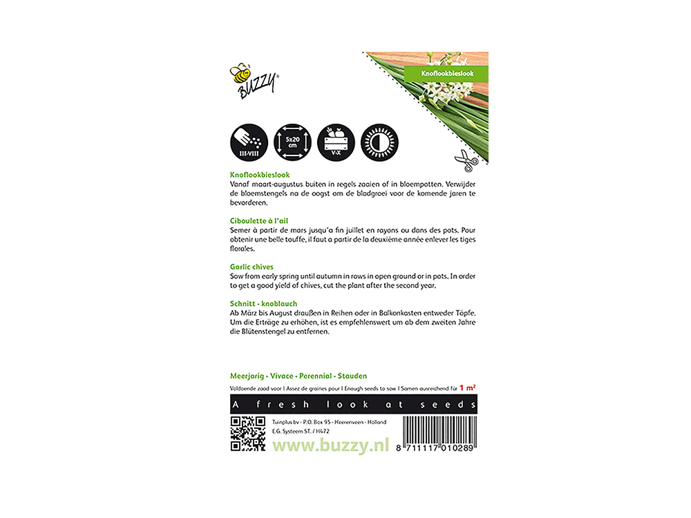 Knoflookbieslook heeft een fijne, delicate knoflooksmaak en produceert lange, smalle, grasachtige stengels. In het tweede jaar komen er mooie violet-blauwe bloemen, waardoor het een populaire borderplant is.